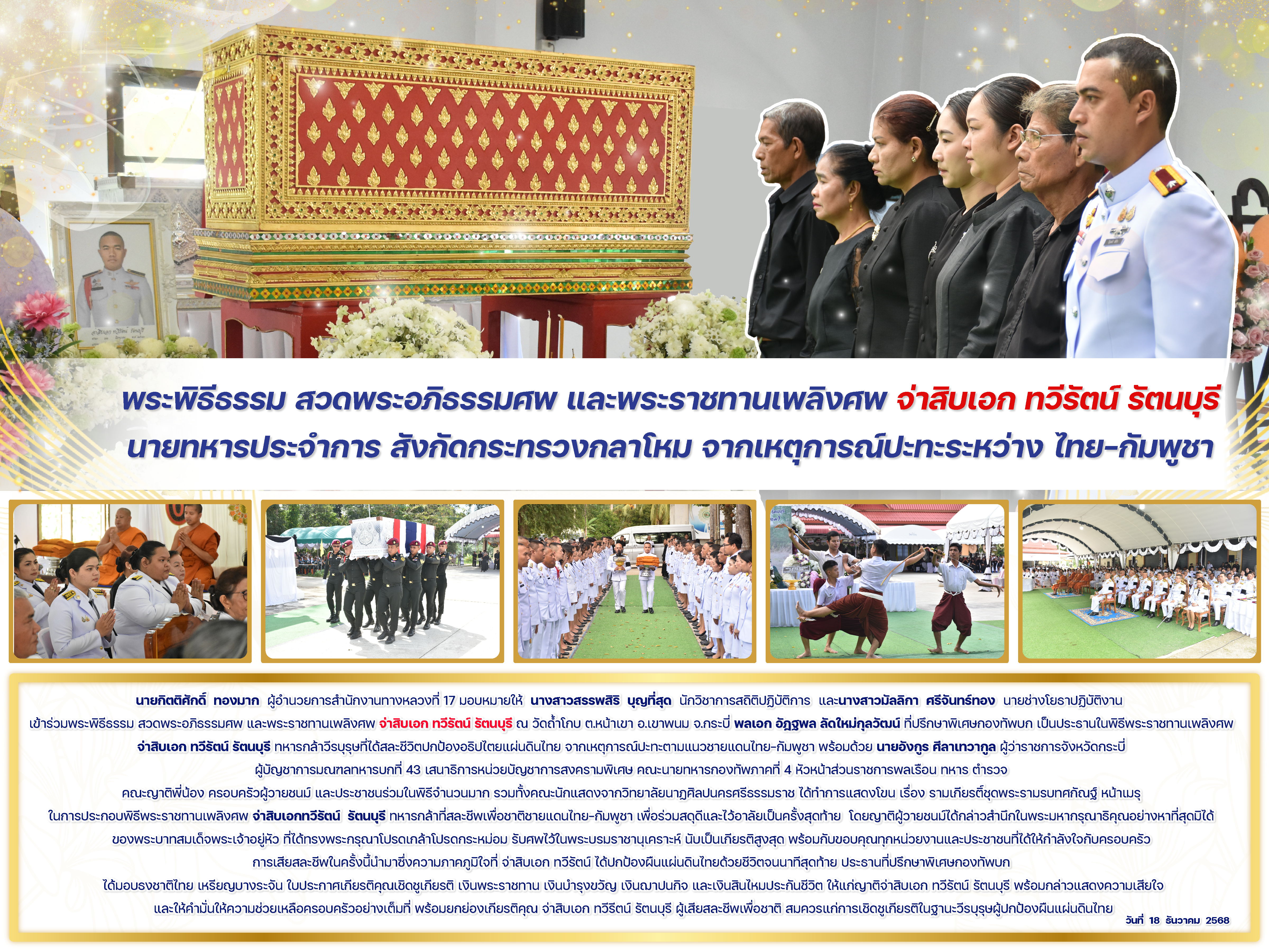 13 25/12/2568 พระพิธีธรรม สวดพระอภิธรรมศพ และพระราชทานเพลิงศพ จ่าสิบเอก ทวีรัตน์ รัตนบุรี นายทหารประจำการ สังกัดกระทรวงกลาโหม จากเหตุการณ์ปะทะระหว่าง ไทย-กัมพูชา วันที่ 18 ธันวาคม 2568