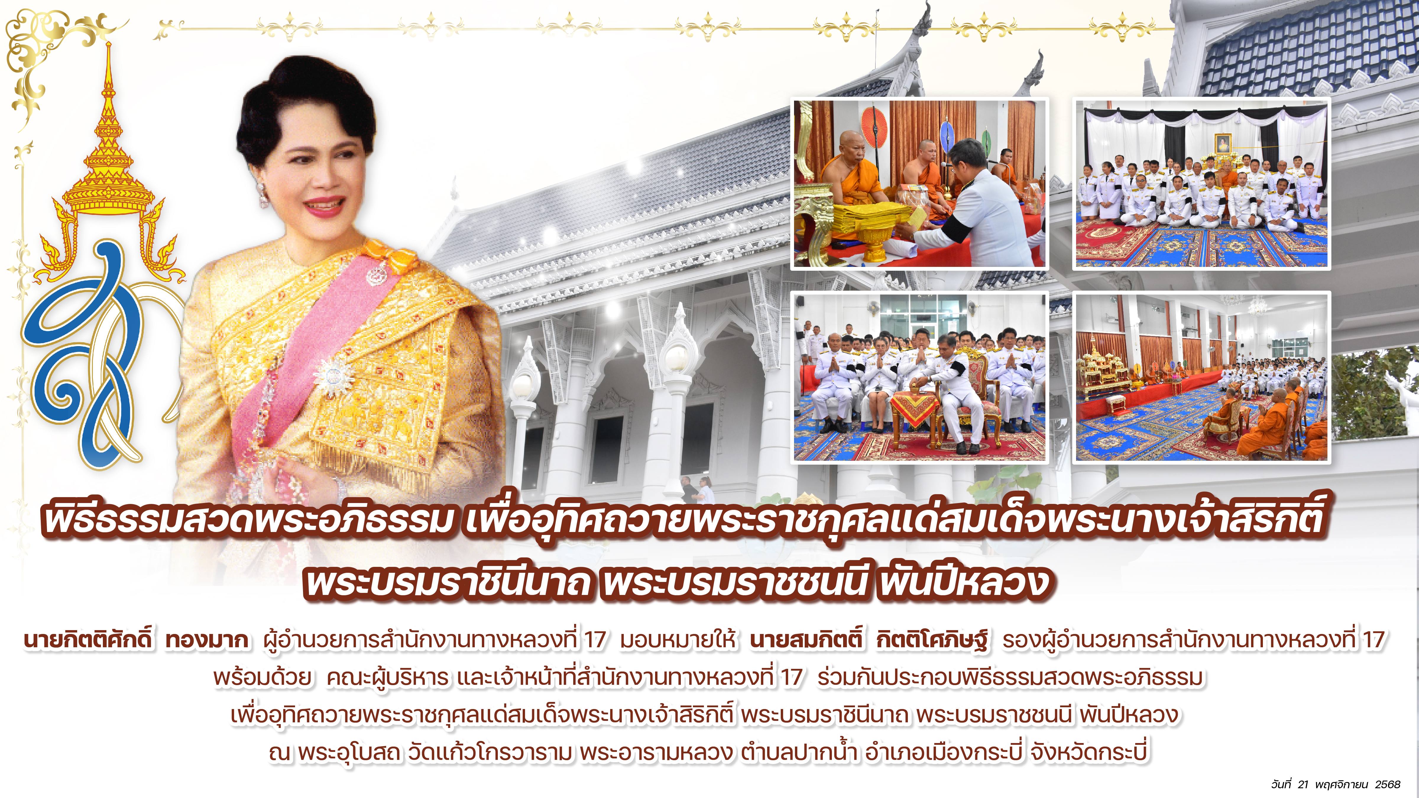 พิธีธรรมสวดพระอภิธรรม เพื่ออุทิศถวายพระราชกุศลแด่สมเด็จพระนางเจ้าสิริกิติ์ พระบรมราชินีนาถ พระบรมราชชนนี พันปีหลวง วันที่ 21 พฤศจิกายน 2568