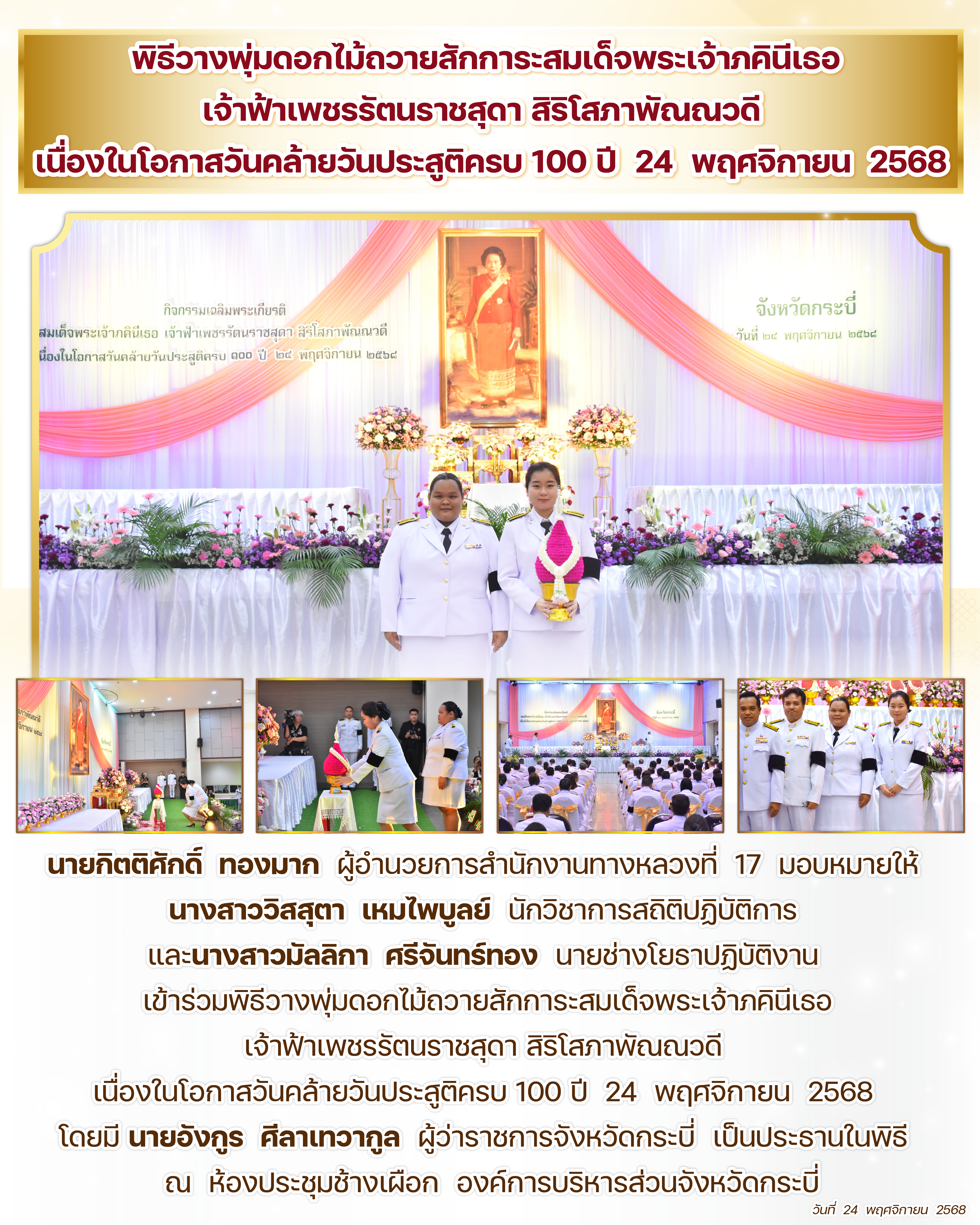 พิธีวางพุ่มดอกไม้ถวายสักการะสมเด็จพระเจ้าภคินีเธอ เจ้าฟ้าเพชรรัตนราชสุดา สิริโสภาพัณณวดี เนื่องในโอกาสวันคล้ายวันประสูติครบ 100 ปี 24 พฤศจิกายน 2568 วันที่ 24 พฤศจิกายน 2568