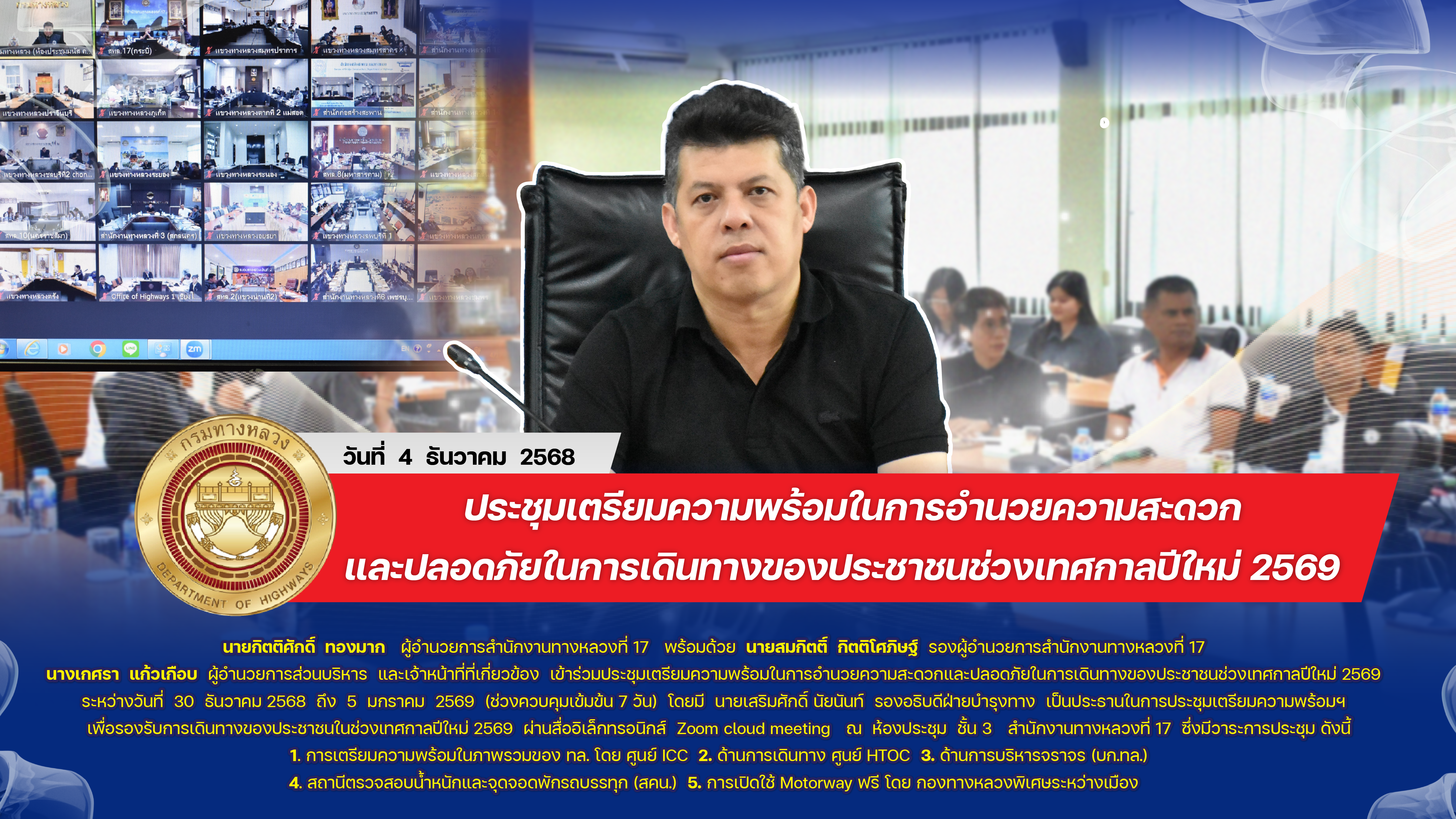 ประชุมเตรียมความพร้อมในการอำนวยความสะดวก และปลอดภัยในการเดินทางของประชาชนช่วงเทศกาลปีใหม่ 2569 วันที่ 4 ธันวาคม 2568