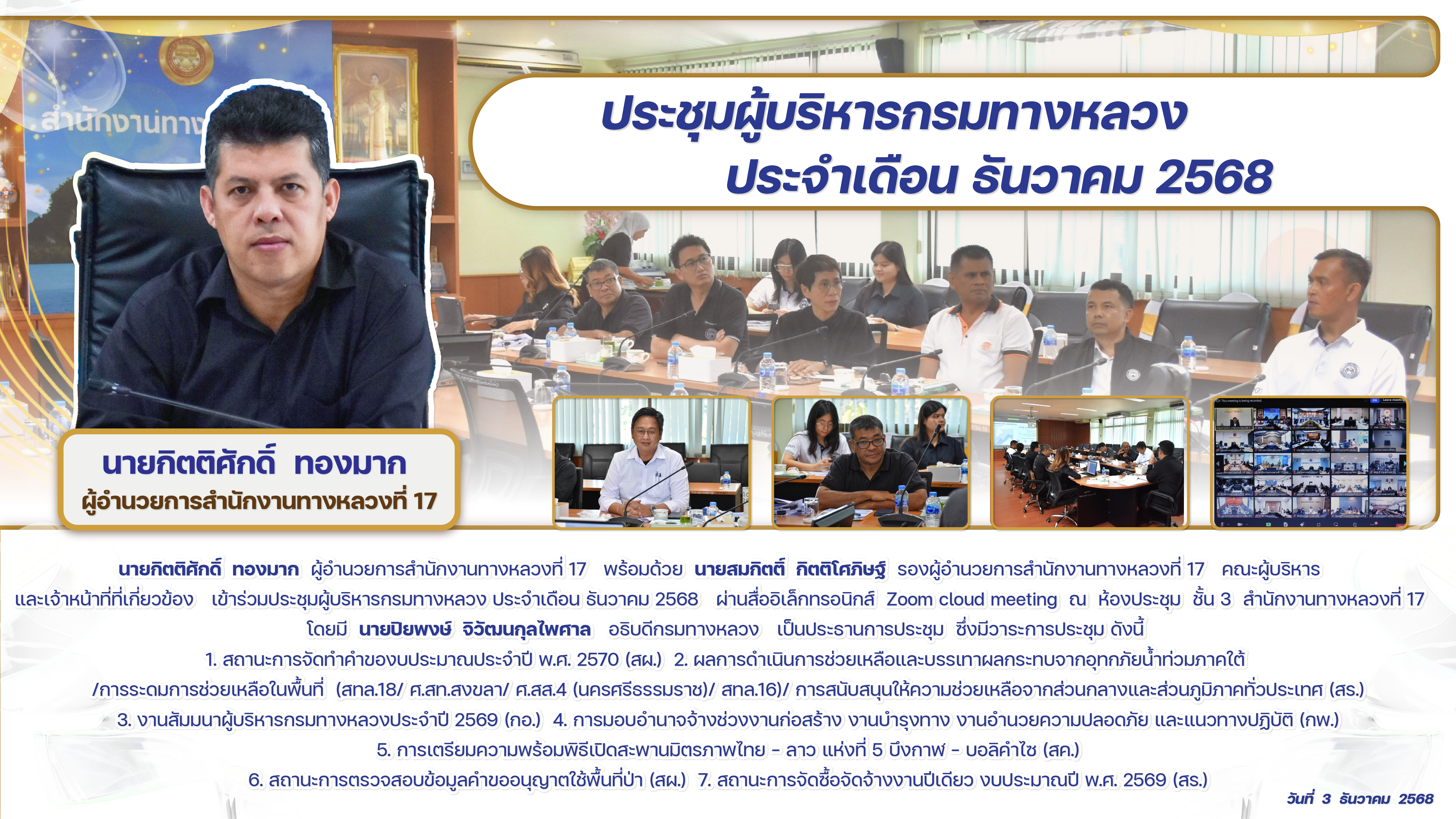 ประชุมผู้บริหารกรมทางหลวง ประจำเดือน ธันวาคม 2568 วันที่ 3 ธันวาคม 2568