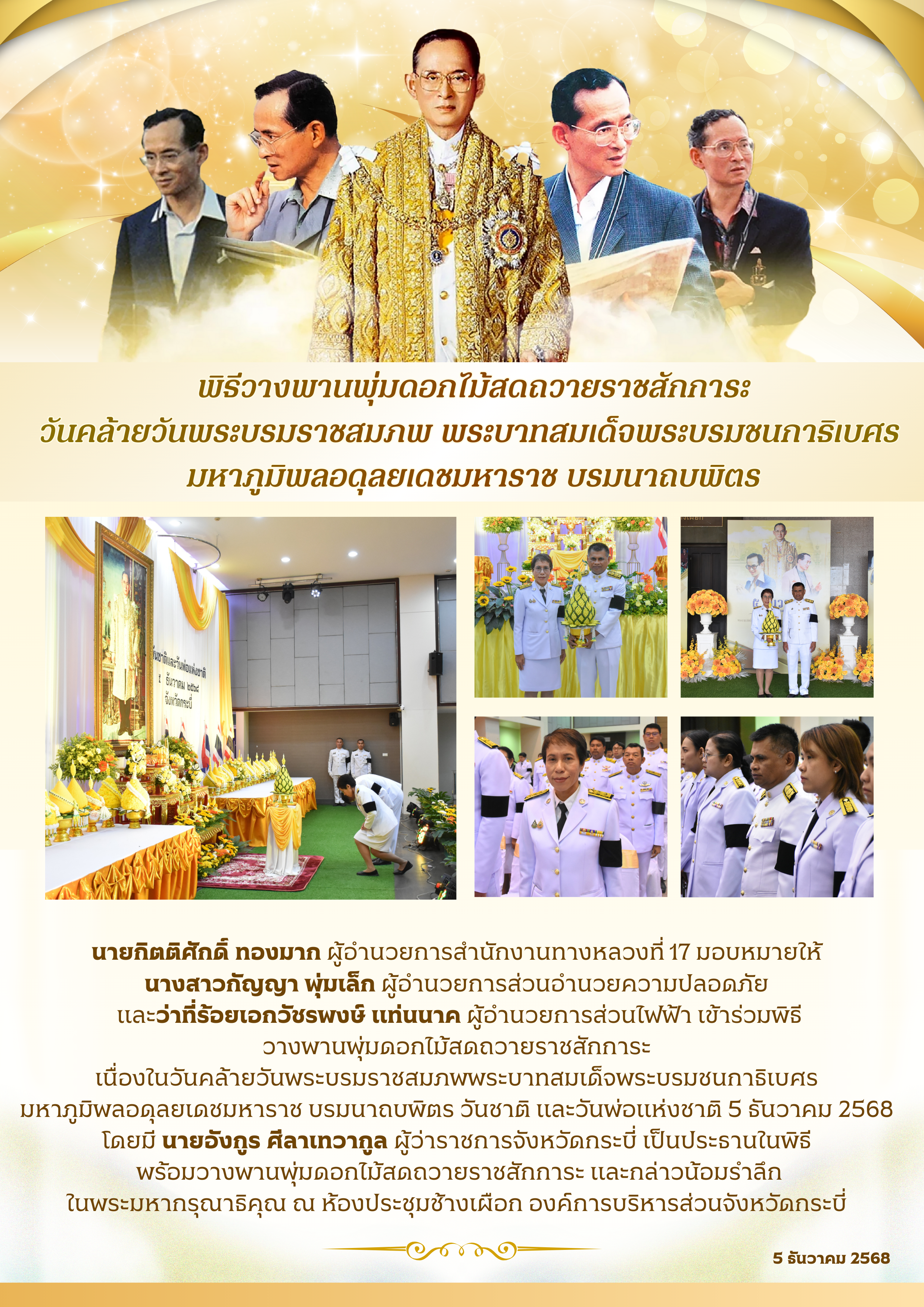 พิธีวางพานพุ่มดอกไม้สดถวายราชสักการะ วันคล้ายวันพระบรมราชสมภพ พระบาทสมเด็จพระบรมชนกาธิเบศร มหาภูมิพลอดุลยเดชมหาราช บรมนาถบพิตร 5 ธันวาคม 2568