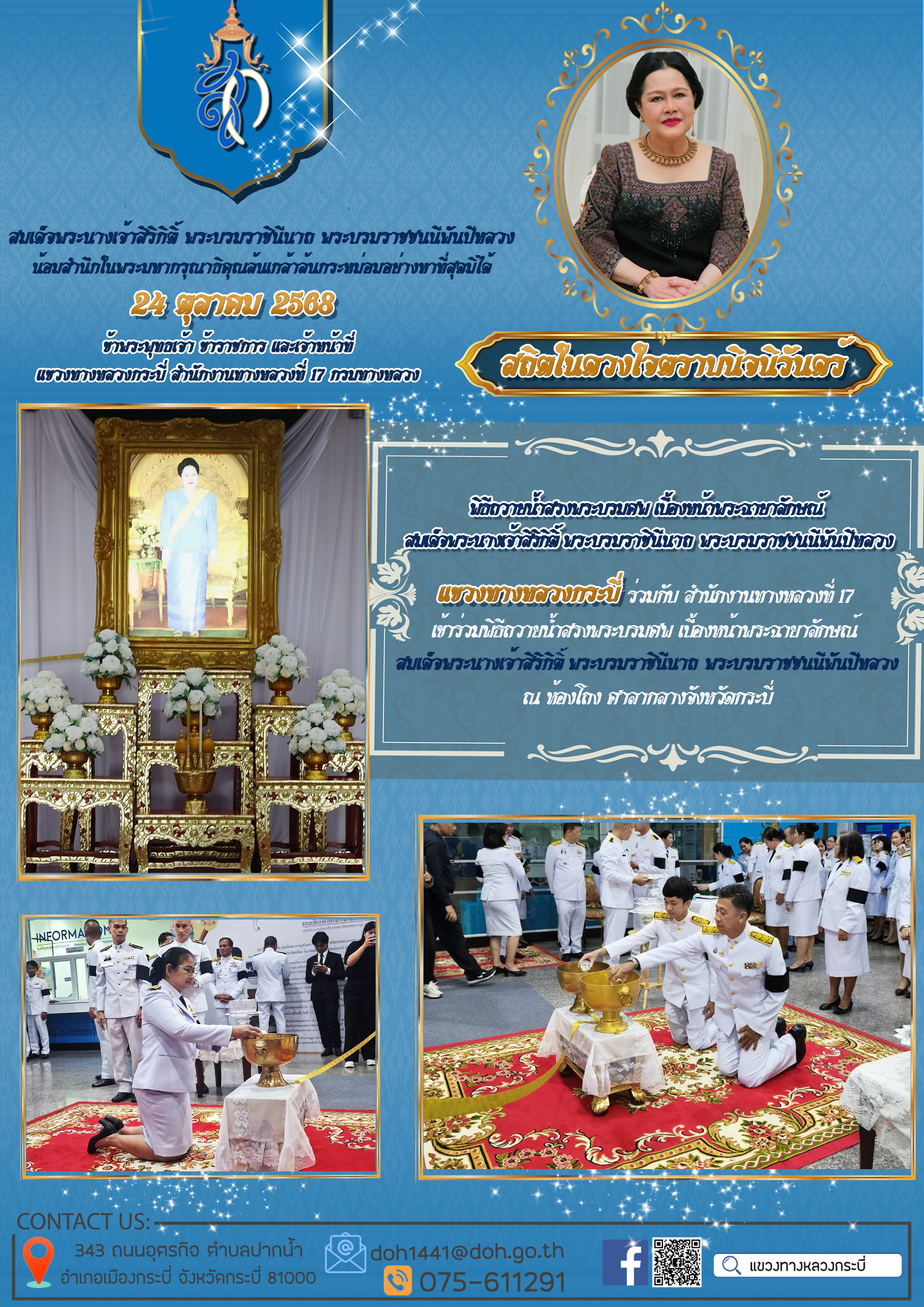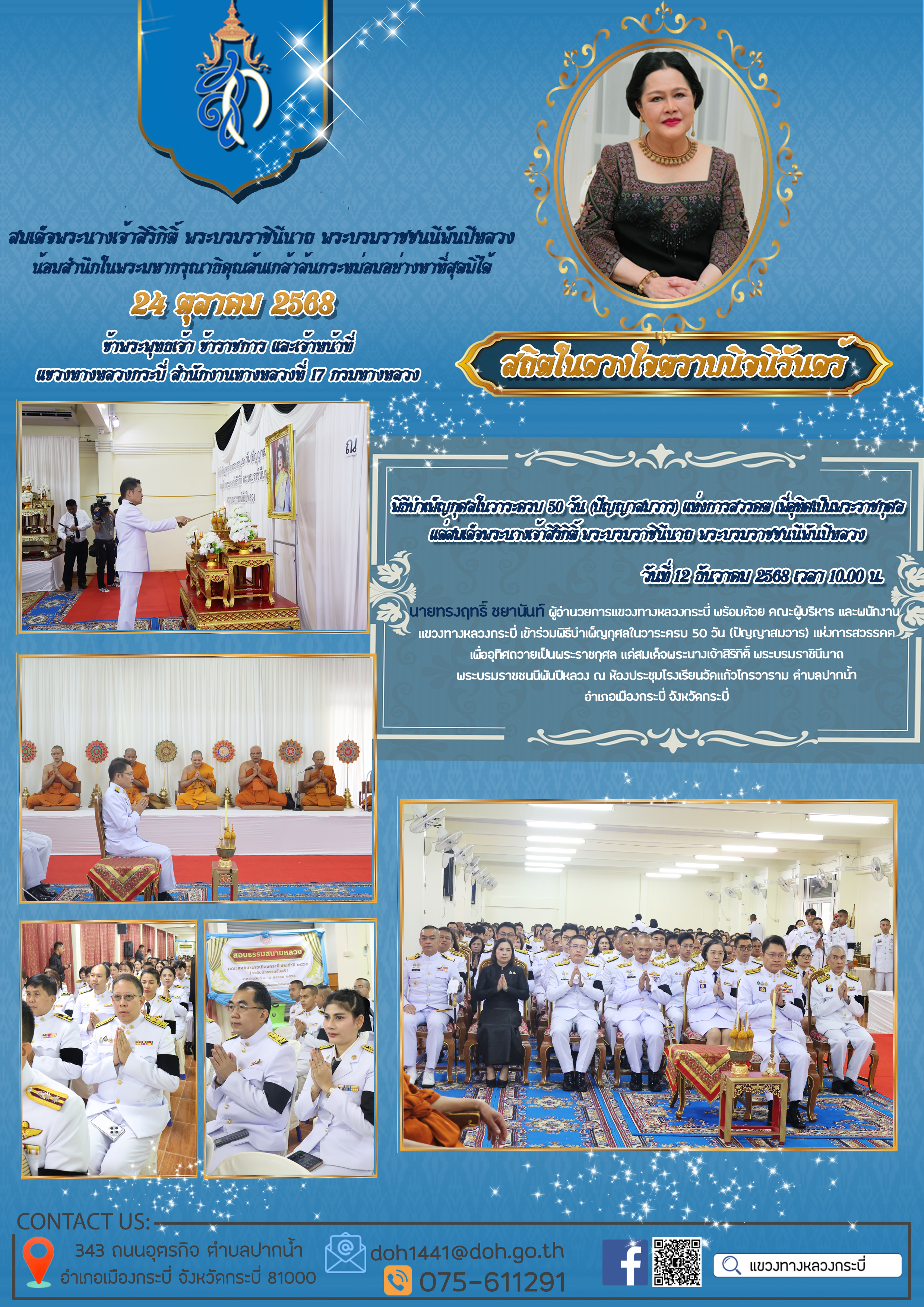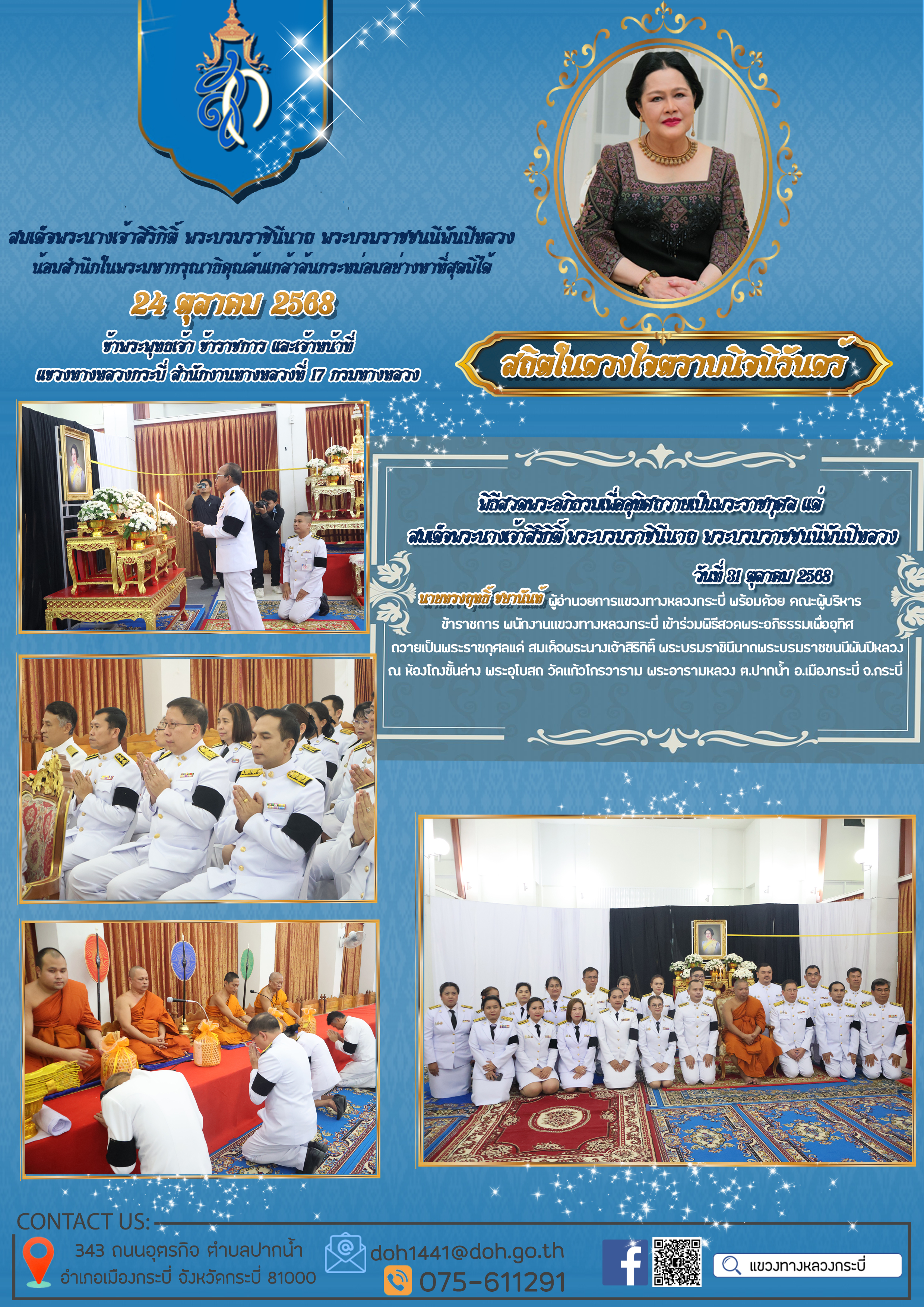 แขวงทางหลวงกระบี่ ร่วมกับหน่วยงานในสังกัดกระทรวงคมนาคมเป็นเจ้าภาพในการประกอบพิธีธรรมสวดพระอภิธรรม เพื่ออุทิศถวายพระราชกุศลแด่สมเด็จพระนางเจ้าสิริกิติ์ พระบรมราชินีนาถ พระบรมราชชนนีพันปีหลวง