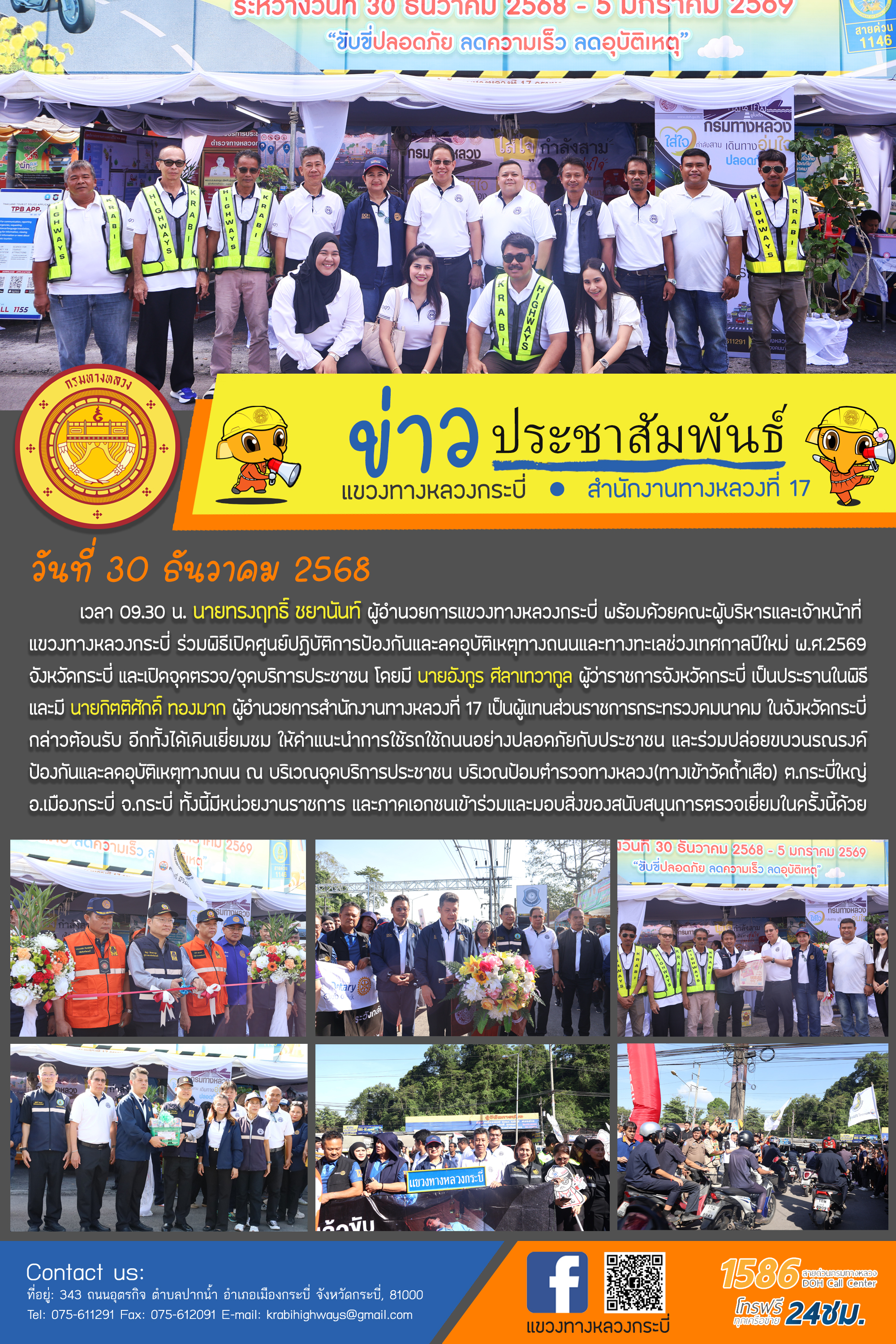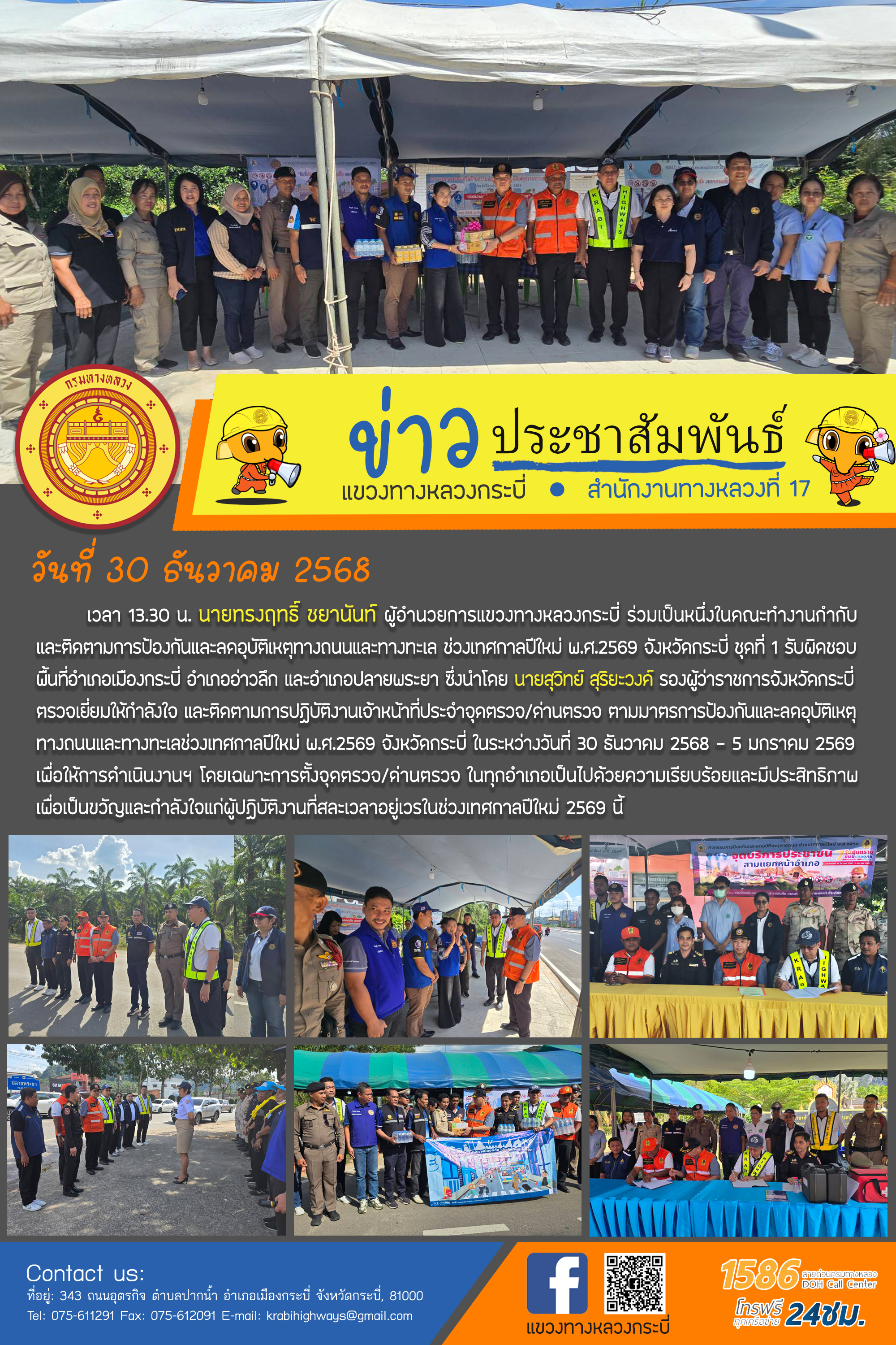 แขวงทางหลวงกระบี่ ร่วมเป็นหนึ่งในคณะทำงานกำกับ และติดตามการป้องกันและลดอุบัติเหตุทางถนนและทางทะเล ช่วงเทศกาลปีใหม่ พ.ศ.2569