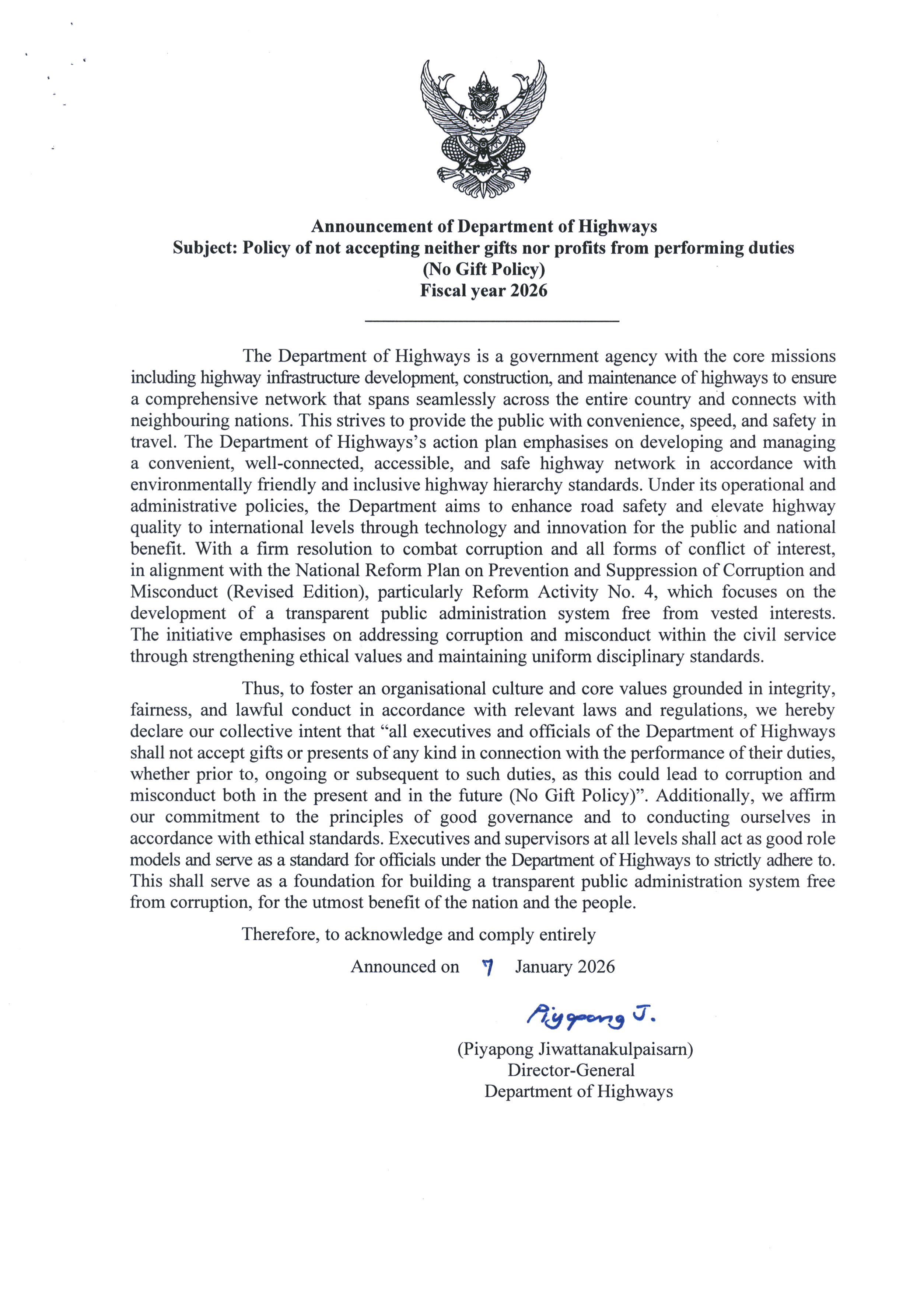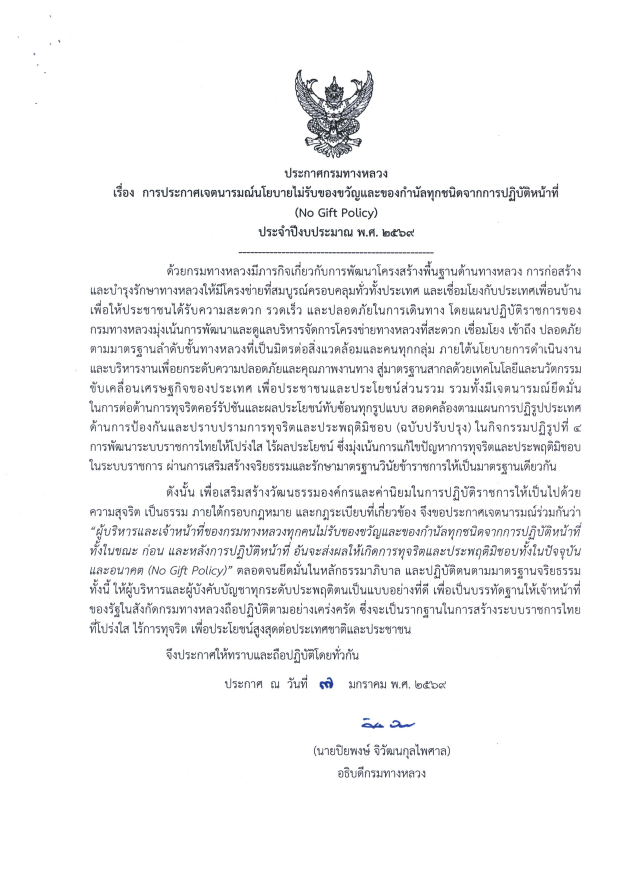 ประกาศกรมทางหลวง เรื่อง การประกาศเจตนารมณ์นโยบายไม่รับของขวัญและของกำนัลทุกชนิดจากการปฏิบัติหน้าที่(No Gift Policy) ประจำปีงบประมาณ พ.ส.2569