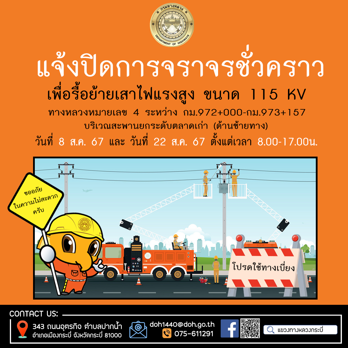 แจ้งเพื่อประชาสัมพันธ์เกี่ยวกับการปิดทางหลวงหมายเลข 4 ระหว่าง กม.970+108 ถึง กม.977+625 ฝั่งขวาทาง