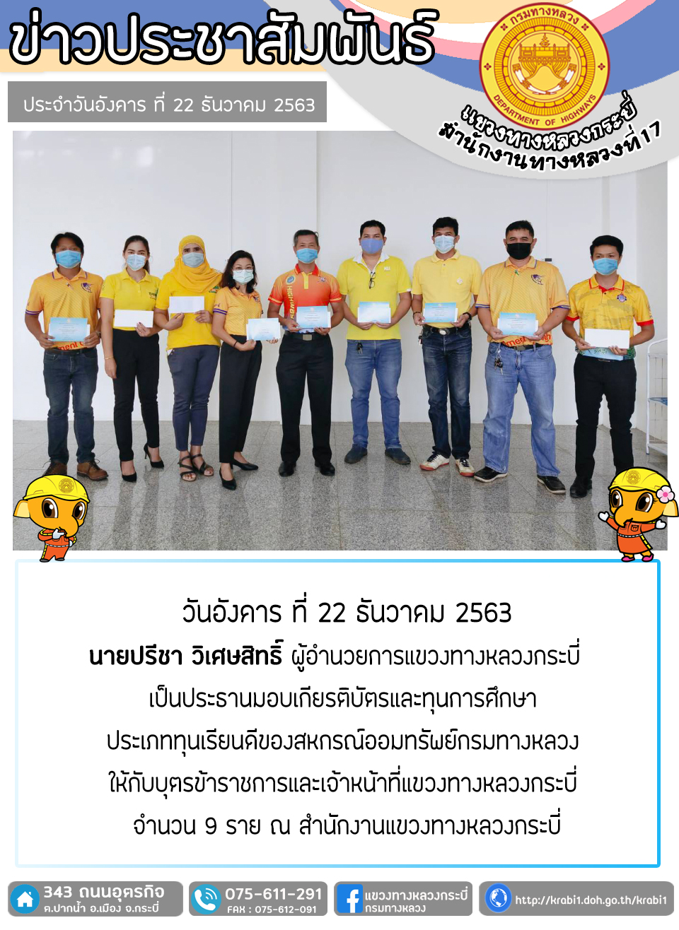 วันอังคาร ที่ 22 ธันวาคม 2563 นายปรีชา? วิเศษสิทธิ์? ผู้อำนวยการแขวงทางหลวงกระบี่? เป็นประธานมอบเกียรติบัตรและทุนการศึกษา? ประเภททุนเรียนดีของสหกรณ์ออมทรัพย์กรมทางหลวง? ให้กับบุตรข้าราชการและเจ้าหน้าที่แขวงทางหลวงกระบี่? จำนวน? 9? ราย? ณ? สำนักงานแขวงทางหลวงกระบี่