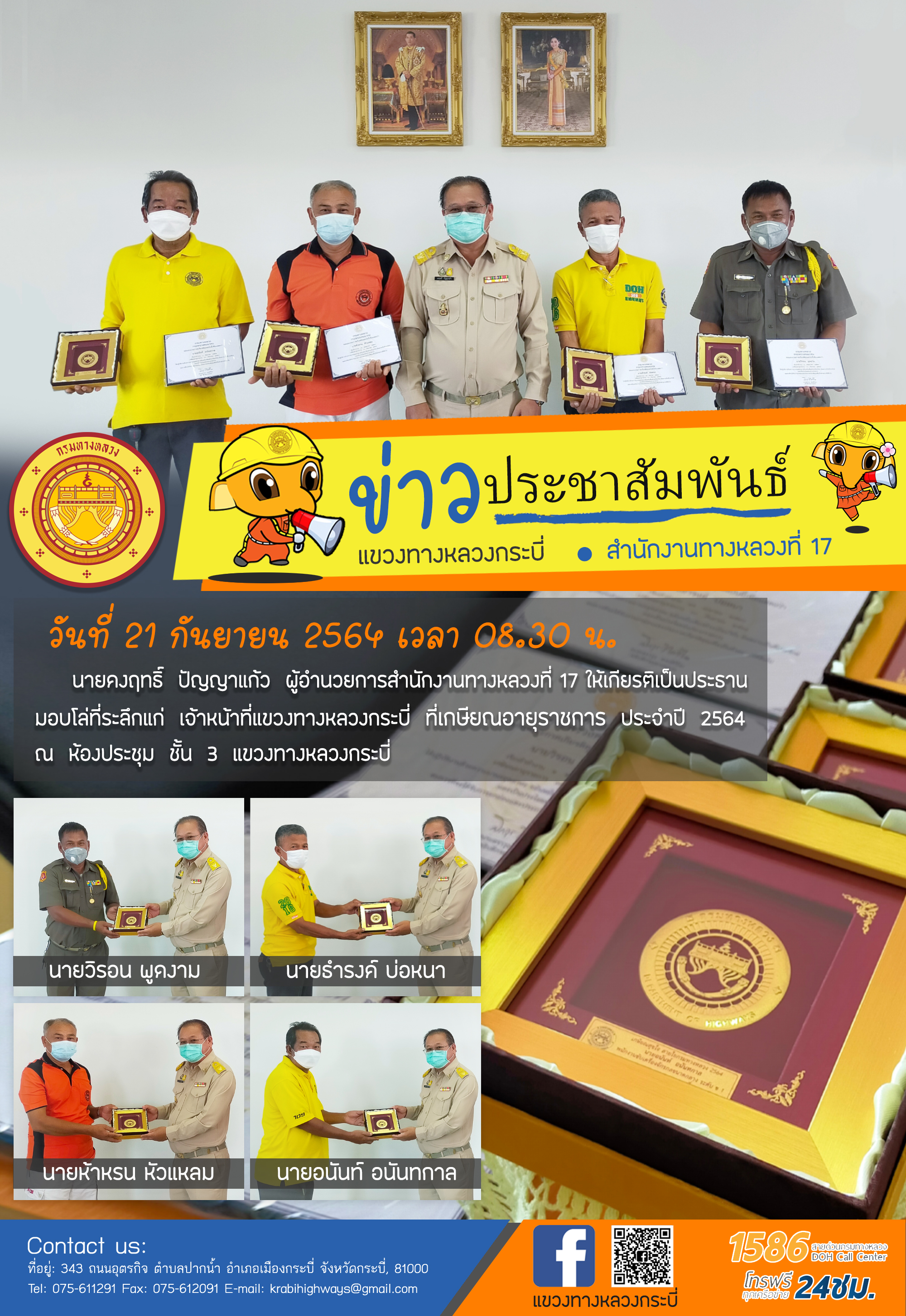 วันที่ 21 กันยายน 2564 เวลา 08.30 น. นายคงฤทธิ์ ปัญญาแก้ว ผู้อำนวยการสำนักงานทางหลวงที่ 17 ให้เกียรติเป็นประธานมอบโล่ที่ระลึกแก่ เจ้าหน้าที่แขวงทางหลวงกระบี่ ที่เกษียณอายุราชการ ประจำปี 2564 ณ ห้องประชุม ชั้น 3 แขวงทางหลวงกระบี่