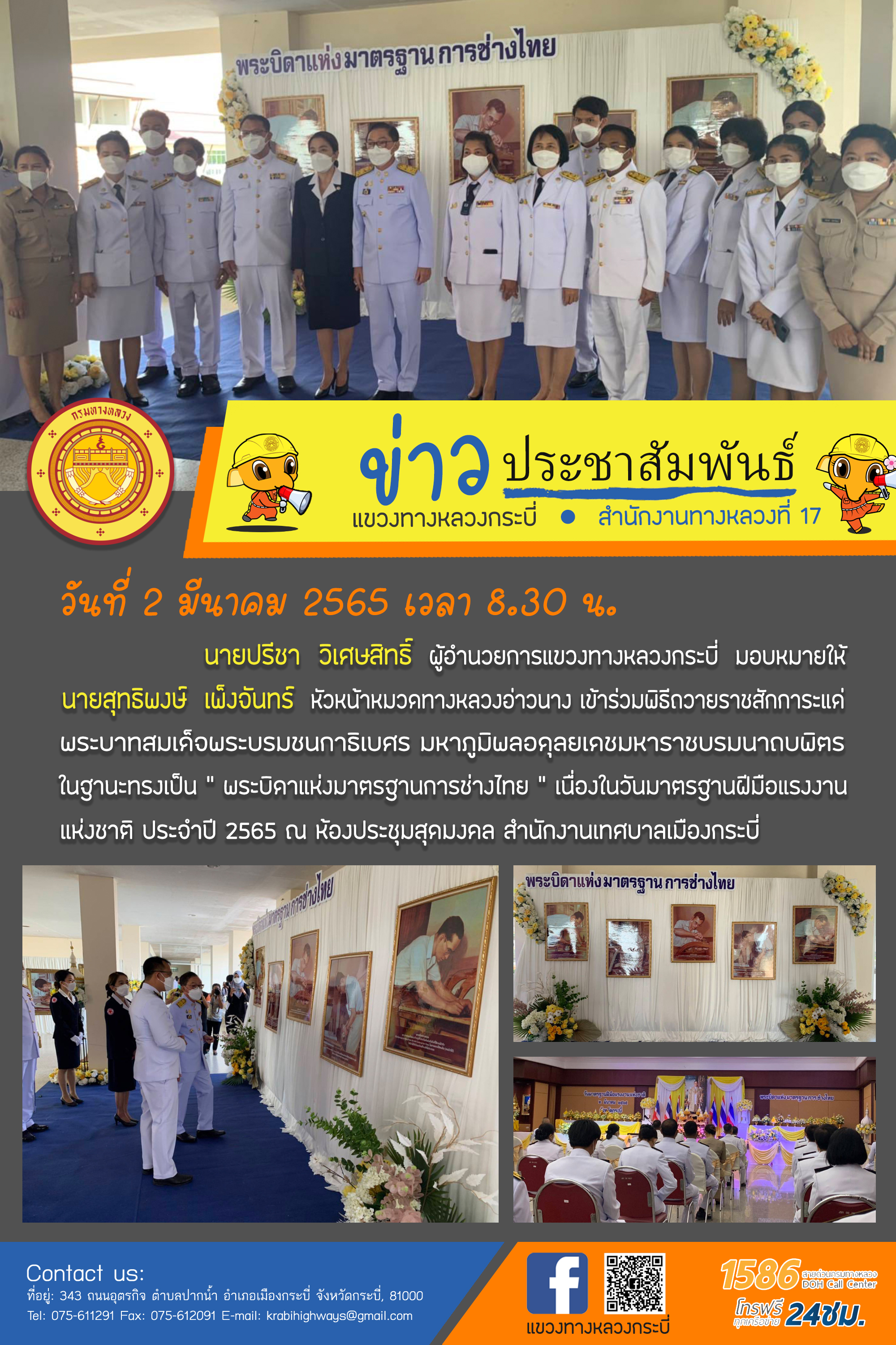 วันที่ 2 มีนาคม 2565 นายปรีชา วิเศษสิทธิ์ ผู้อำนวยการแขวงทางหลวงกระบี่ มอบหมายให้ นาย สุทธิพงษ์ เพ็งจันทร์ หัวหน้าหมวดทางหลวงอ่าวนาง เข้าร่วมพิธีถวายราชสักการะแด่พระบาทสมเด็จพระบรมชนกาธิเบศร มหาภูมิพลอดุลยเดชมหาราชบรมนาถบพิตร ในฐานะทรงเป็น "พระบิดาแห่งมาตรฐานการช่างไทย" เนื่องในวันมาตรฐานฝีมือแรงงานแห่งชาติ ประจำปั พ.ศ. 2565 ณ ห้องประชุมสุดมงคล สำนักงานเทศบาลเมืองกระบี่ จังหวัดกระบี่ เวลา 8.30 น.