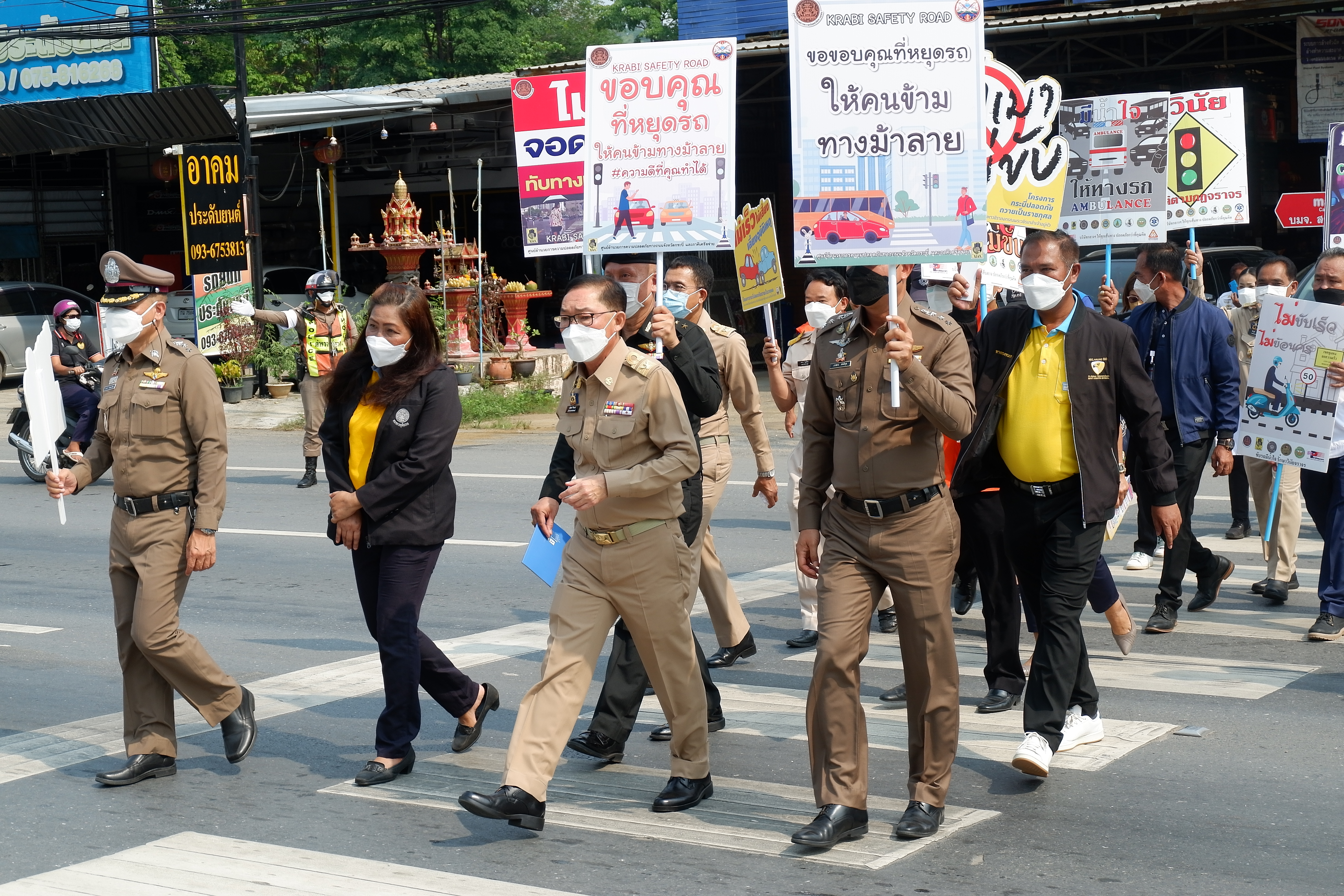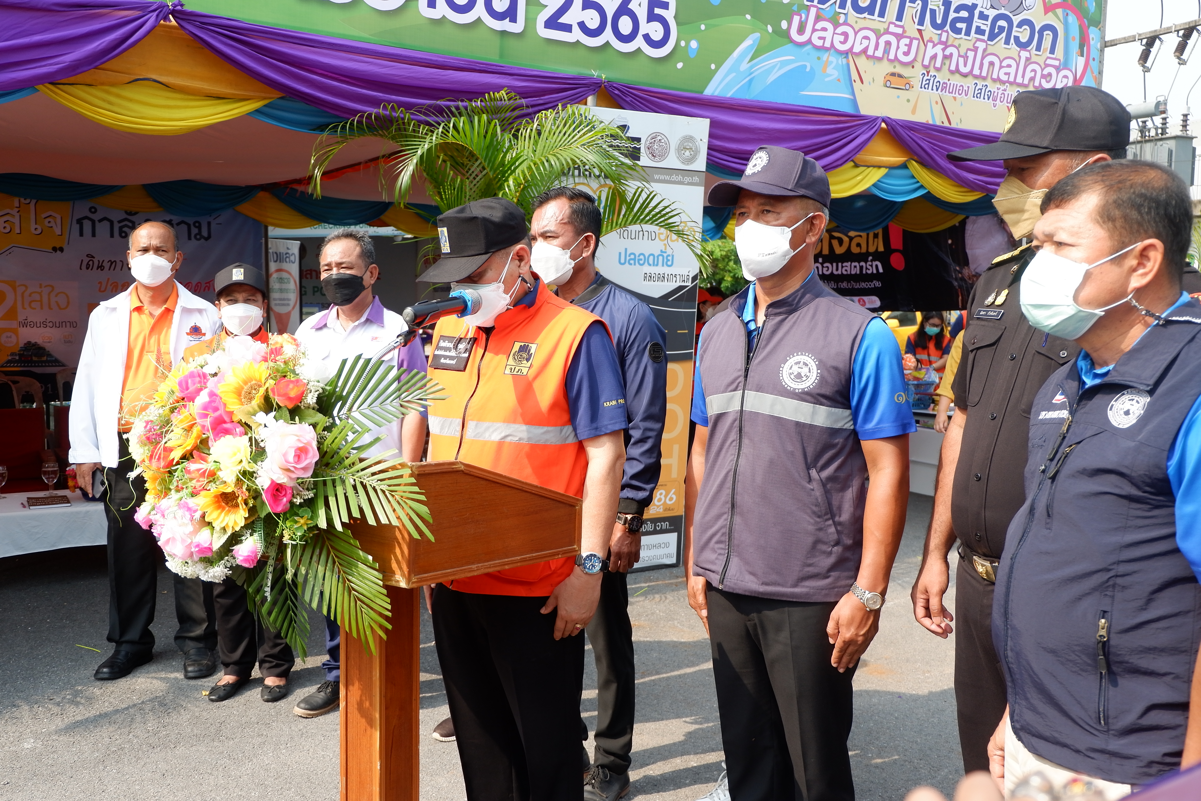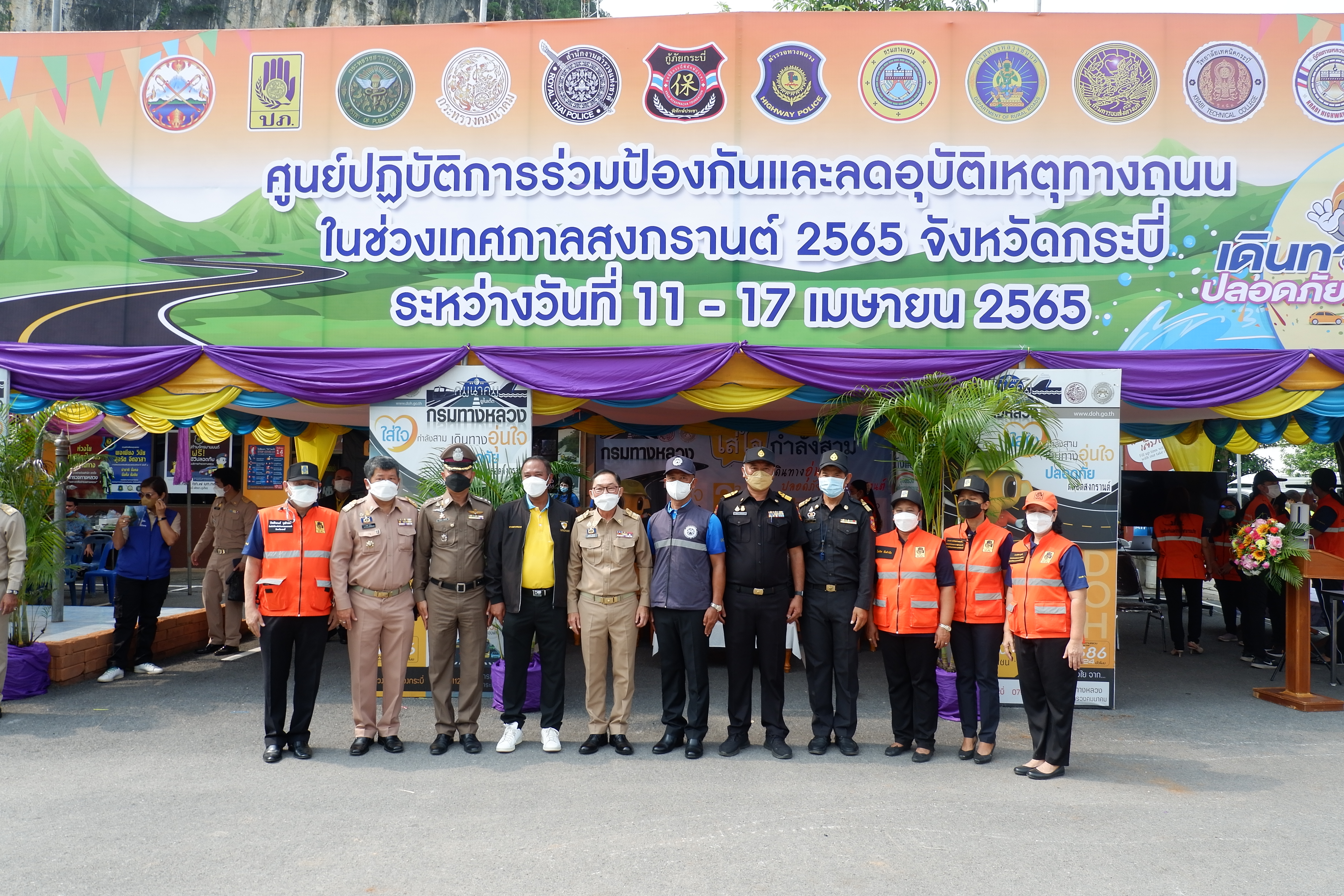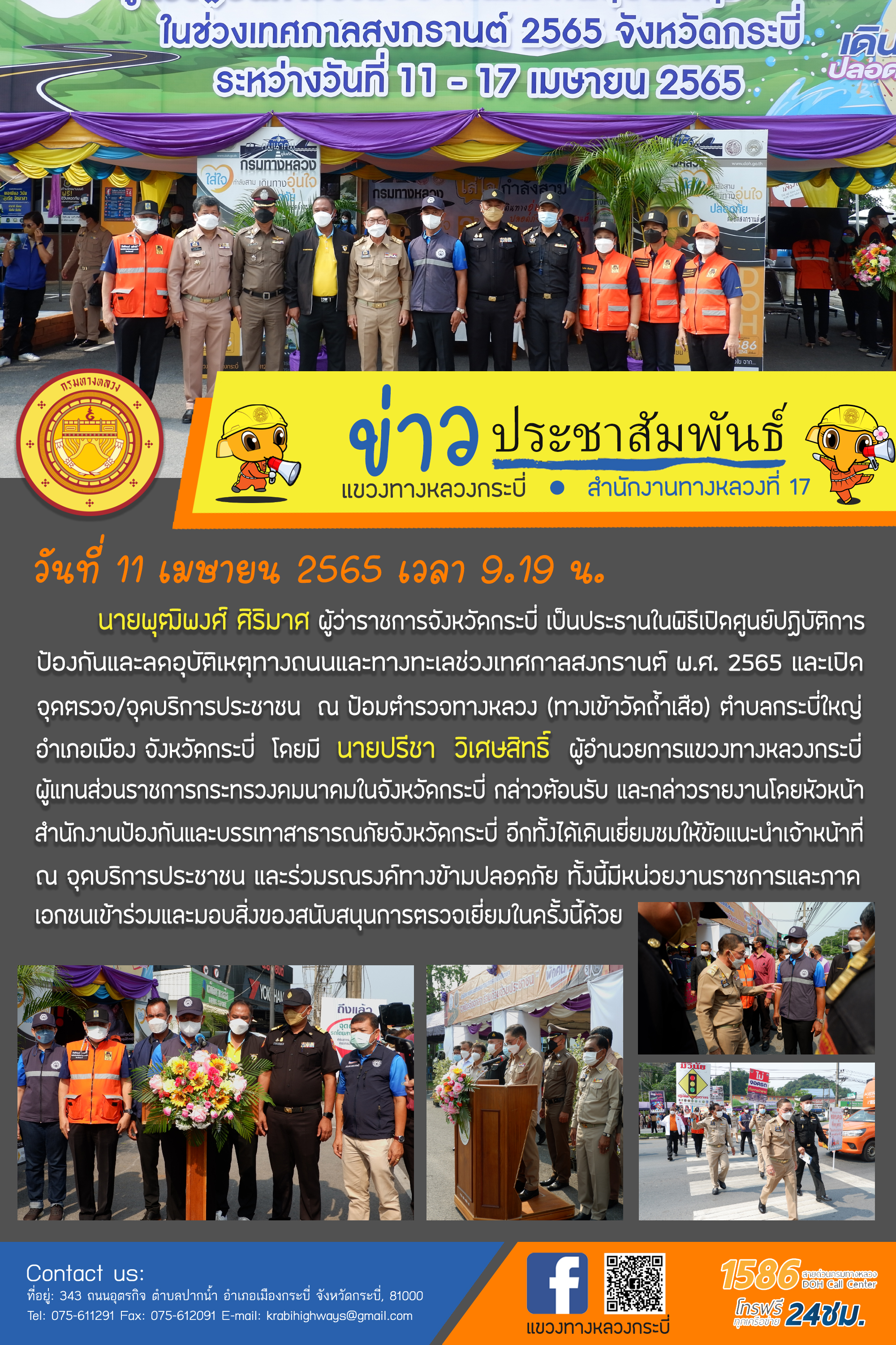 วันที่ 11 เมษายน 2565 เวลา 9.19 น. นายพุฒิพงศ์ ศิริมาศ ผู้ว่าราชการจังหวัดกระบี่ เป็นประธานในพิธีเปิดศูนย์ปฏิบัติการป้องกันและลดอุบัติเหตุทางถนนและทางทะเลช่วงเทศกาลสงกรานต์ พ.ศ. 2565 และเปิดจุดตรวจ/จุดบริการประชาชน ณ ป้อมตำรวจทางหลวง (ทางเข้าวัดถ้ำเสือ) ตำบลกระบี่ใหญ่ อำเภอเมือง จังหวัดกระบี่ โดยมี นายปรีชา วิเศษสิทธิ์ ผู้อำนวยการแขวงทางหลวงกระบี่ ผู้แทนส่วนราชการกระทรวงคมนาคมในจังหวัดกระบี่ กล่าวต้อนรับ และกล่าวรายงานโดยหัวหน้าสำนักงานป้องกันและบรรเทาสาธารณภัยจังหวัดกระบี่ อีกทั้งได้เดินเยี่ยมชมให้ข้อแนะนำเจ้าหน้าที่ ณ จุดบริการประชาชน และร่วมรณรงค์ทางข้ามปลอดภัย ทั้งนี้มีหน่วยงานราชการและภาคเอกชนเข้าร่วมและมอบสิ่งของสนับสนุนการตรวจเยี่ยมในครั้งนี้ด้วย