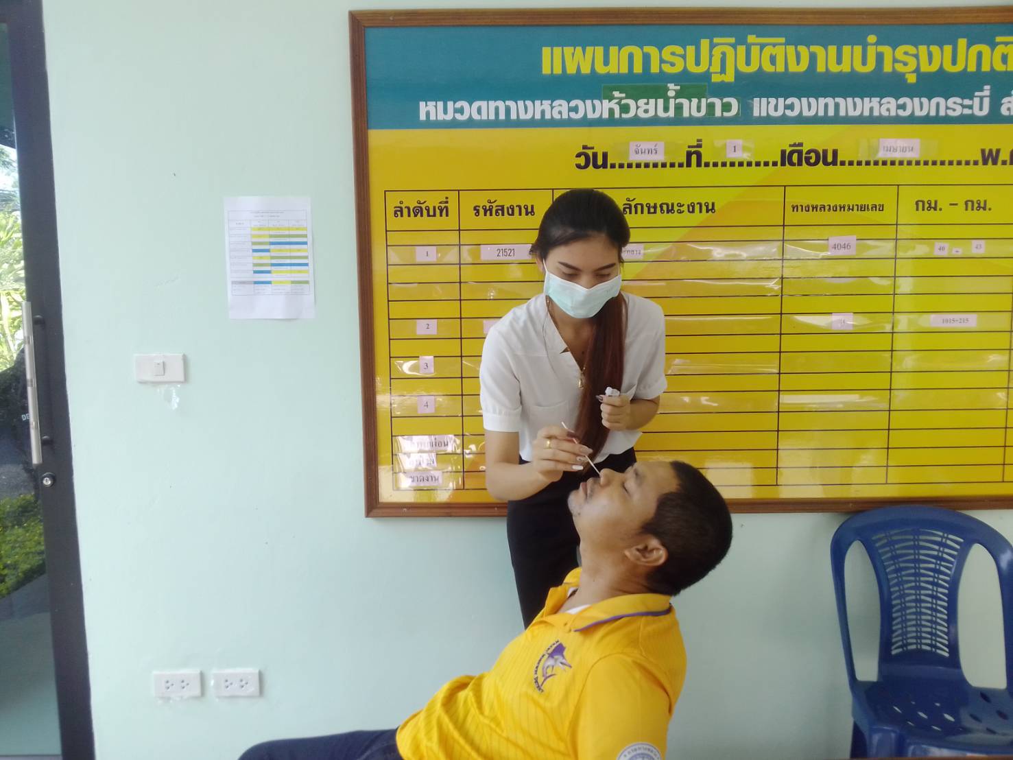วันที่ 18 เมษายน 2565 เวลา 08.00 น. แขวงทางหลวงกระบี่ ตรวจ ATK ให้กับข้าราชการและเจ้าหน้าที่ในสังกัด ก่อนเข้าปฏิบัติงาน หลังจากหยุดต่อเนื่องช่วงเทศกาลสงกรานต์ 2565 ที่ผ่านมา ตามมาตรการควบคุมโรคแบบบูรณาการและแนวปฏิบัติด้านสาธารณสุข และ มาตรการปลอดภัยสำหรับองค์กร (COVID Free Setting) โดยพบผู้ติดเชื้อ จำนวน 3 ราย จากข้าราชการและเจ้าหน้าที่ทั้งหมด 217 ราย ทั้งนี้ แขวงทางหลวงกระบี่ยังคงปฏิบัติตามมาตรการ DMHTTA อันได้แก่ รักษาระยะห่างระหว่างกันอย่างน้อย 1-2 เมตร, สวมหน้ากากอนามัยตลอดเวลา, ล้างมือด้วยน้ำสบู่หรือเจลแอลกอฮอล์ อย่างสม่ำเสมอ, ตรวจวัดอุณหภูมิร่างกาย และใช้งาน แอปพลิเคชั่น ไทยชนะ, หมอชนะ เพื่อป้องกันการแพร่ระบาดของโรคติดเชื้อไวรัสโคโรนา (โควิด-19) อย่างเคร่งครัด