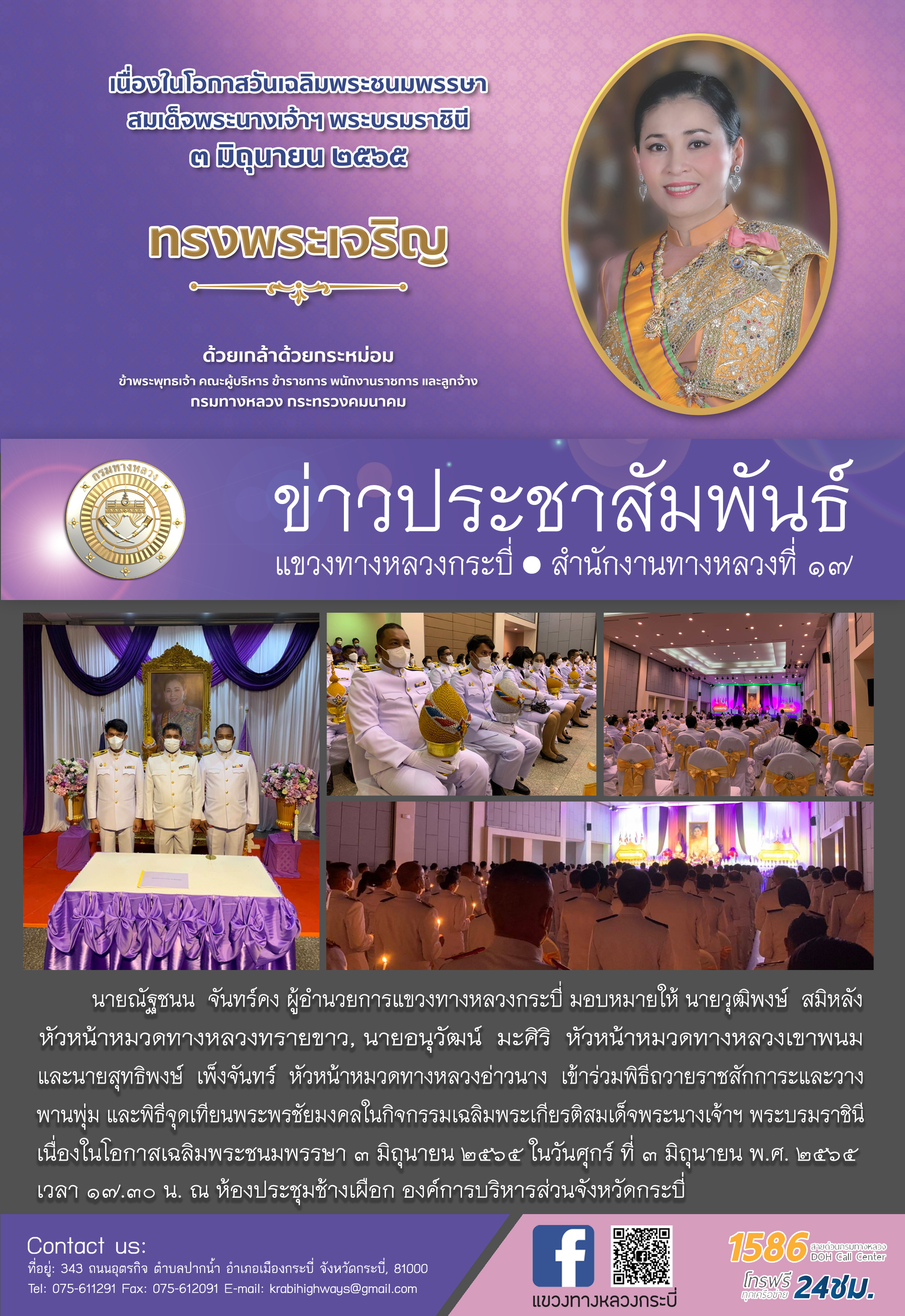 วันที่ 3 มิถุนายน 2565 แขวงทางหลวงกระบี่เข้าร่วมกิจกรรมเฉลิมพระเกียรติสมเด็จพระนางเจ้าฯ พระบรมราชินี เนื่องในโอกาสเฉลิมพระชนมพรรษา 3 มิถุนายน 2565 โดย นายณัฐชนน จันทร์คง ผู้อำนวยการแขวงทางหลวงกระบี่ มอบหมายให้นางสาวณรมา วรกลั่น นักวิชาการพัสดุปฏิบัติการ และเจ้าหน้าที่ฝ่ายบริหารงานทั่วไป แขวงทางหลวงกระบี่ เข้าร่วมพิธีทำบุญ ตักบาตรถวายพระราชกุศล พระสงฆ์และสามเณร จำนวน 44 รูป เวลา 06.30 น. ณ บริเวณพระอุโบสถวัดแก้วโกรวาราม พระอารามหลวง อำเภอเมืองกระบี่ จังหวัดกระบี่ และมอบหมายให้ นายวุฒิพงษ์ สมิหลัง หัวหน้าหมวดทางหลวงทรายขาว, นายอนุวัฒน์ มะศิริ หัวหน้าหมวดทางหลวงเขาพนม และนายสุทธิพงษ์ เพ็งจันทร์ หัวหน้าหมวดทางหลวงอ่าวนาง เข้าร่วมพิธีถวายราชสักการะและวางพานพุ่ม และพิธีจุดเทียนพระพรชัยมงคล เวลา 17.30 น. ณ ห้องประชุมช้างเผือก องค์การบริหารส่วนจังหวัดกระบี่