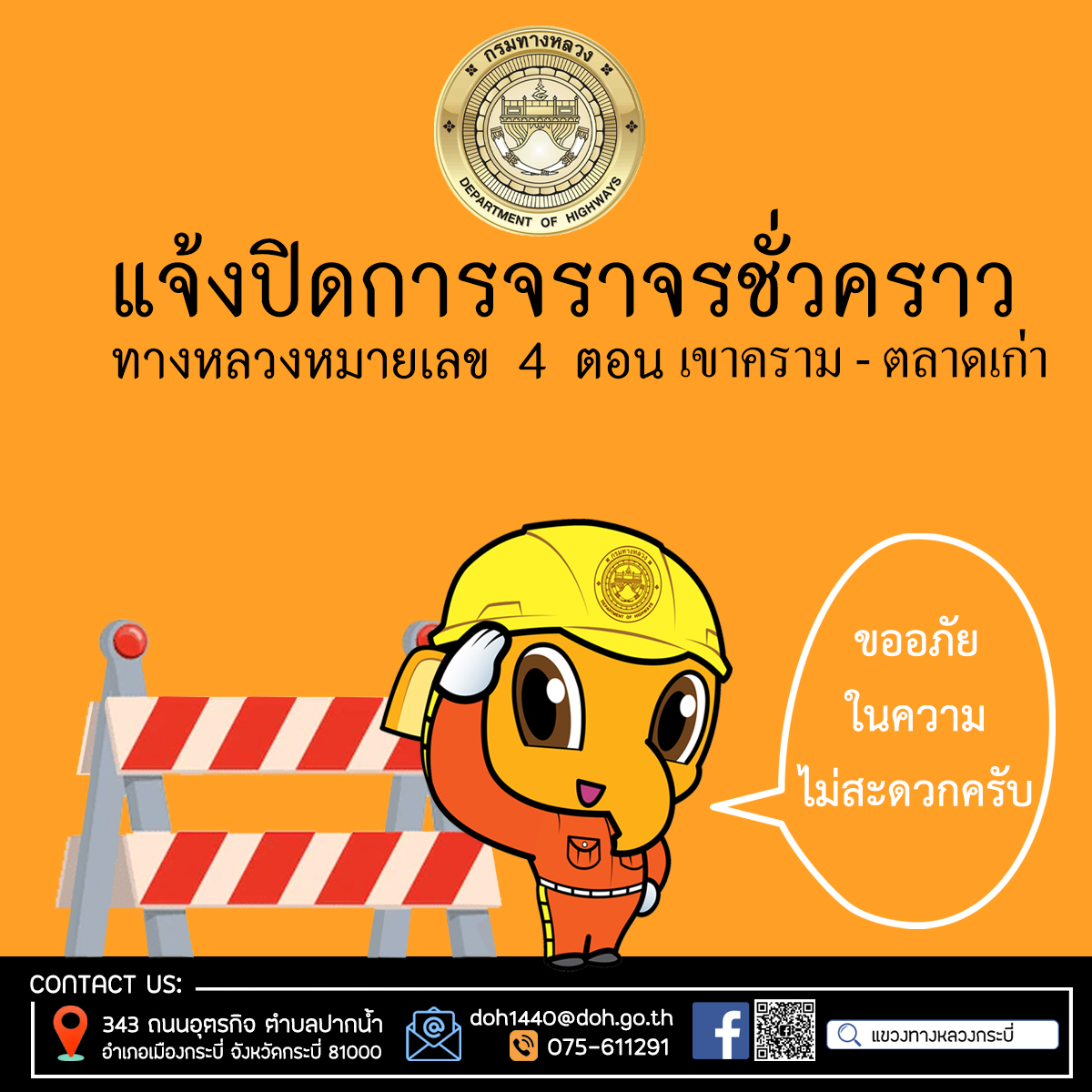 ด้วย ผู้รับจ้าง บริษัท วรรณเกษม คอนสตรัคชั่น จำกัด โครงการก่อสร้างสถานีตรวจสอบน้ำหนักลูกข่าย (Virtual Weigh Station) ทางหลวงหมายเลข 4 ตอน เขาคราม - ตลาดเก่า จ.กระบี่ มีความประสงค์ เข้าดำเนินการก่อสร้างถนนคอนกรีต จึงขออนุญาตปิดการจราจรเป็นการชั่วคราว โดยมีรายละเอียด ดังนี้
