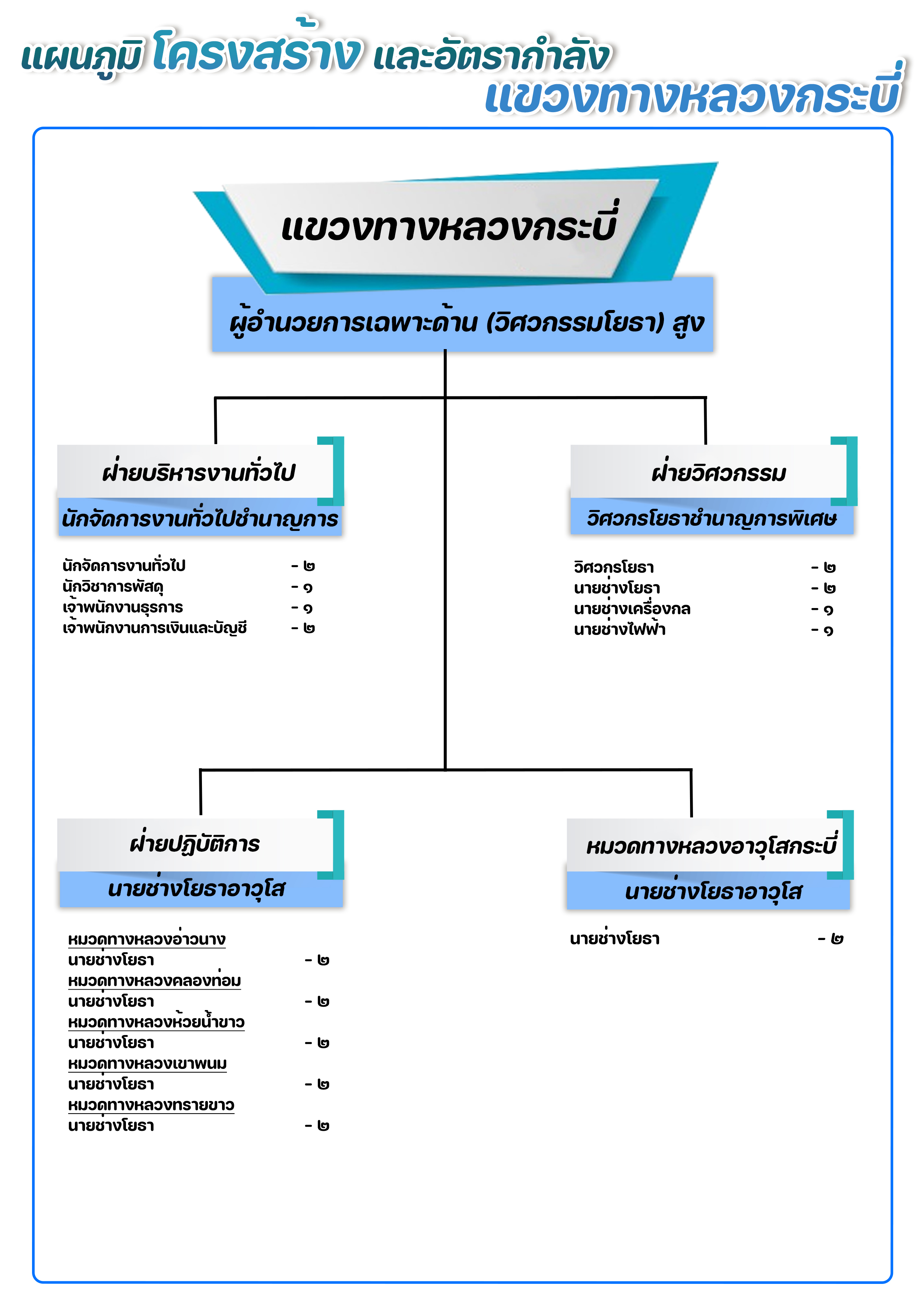 1. รองผู้อำนวยการแขวงทางหลวงกระบี่ ฝ่ายบริหาร หรือ รอ.ขท.กระบี่ (บ) มีหน่วยงานในความรับผิดชอบ ดังนี้