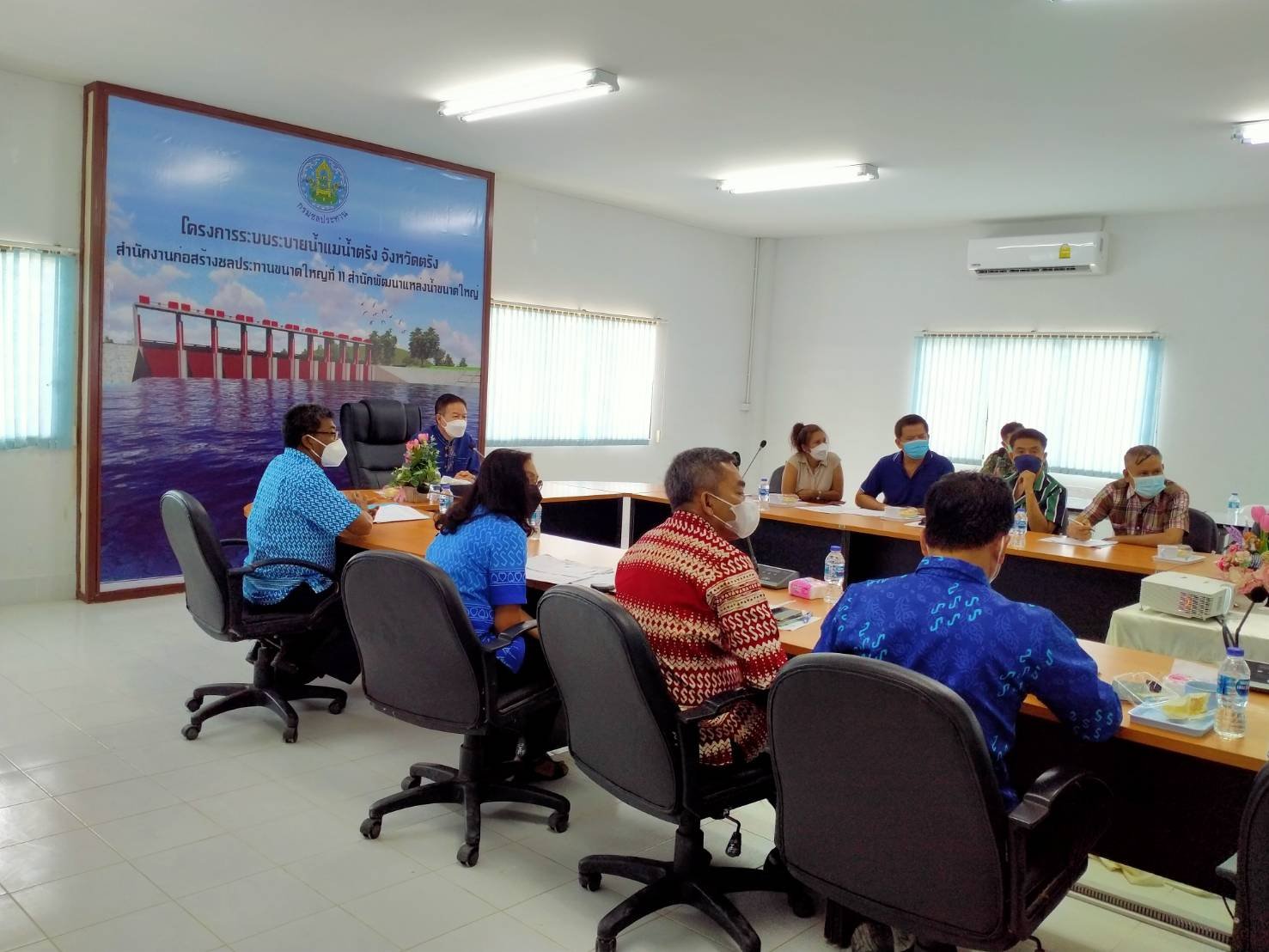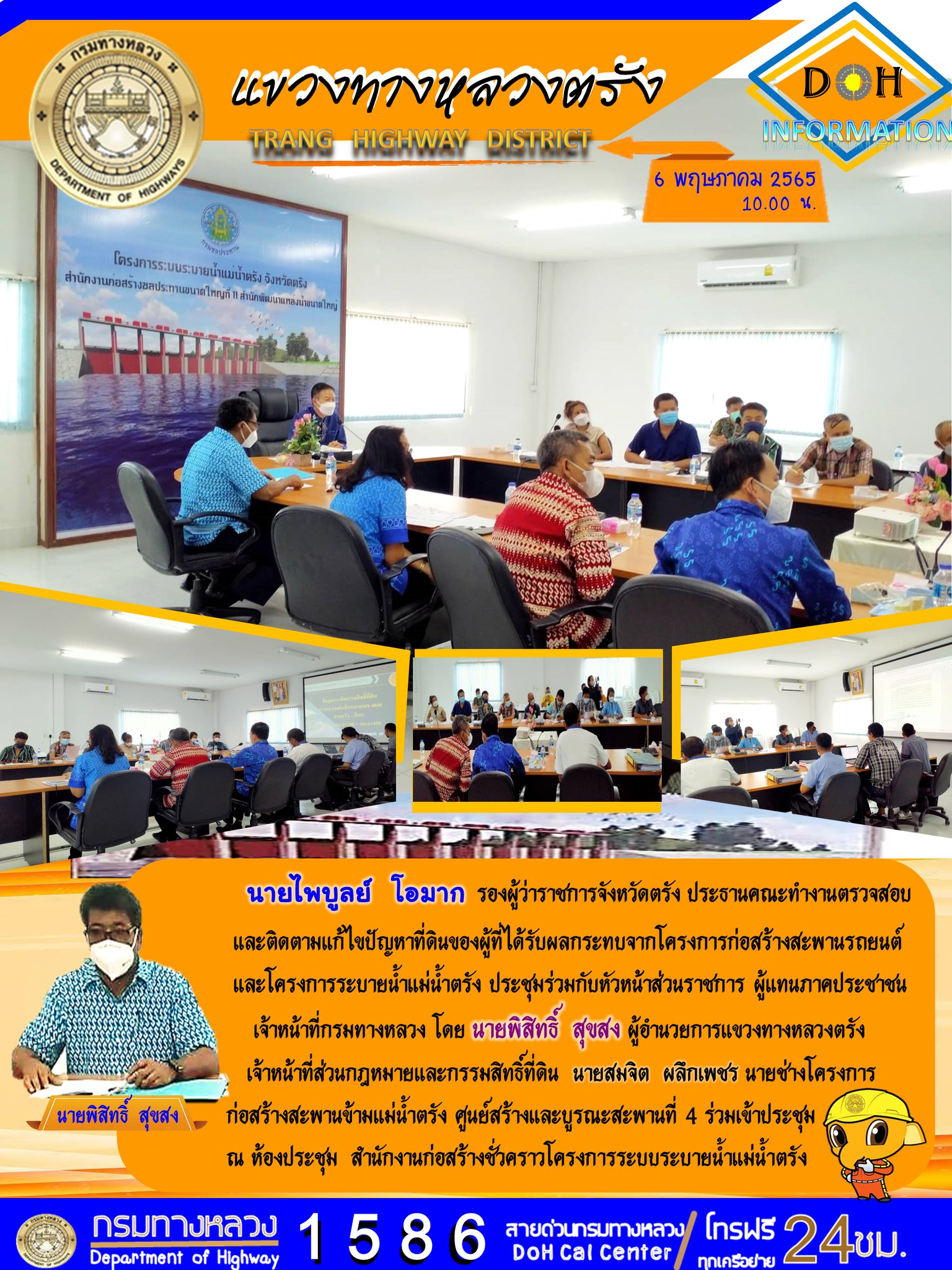 นายไพบูลย์ โอมาก รองผู้ว่าราชการจังหวัดตรัง ประธานคณะทำงานตรวจสอบและติดตามแก้ไขปัญหาที่ดินของผู้ที่ได้รับผลกระทบจากโครงการก่อสร้างสะพานรถยนต์และโครงการระบายน้ำแม่น้ำตรัง ประชุมร่วมกับหัวหน้าส่วนราชการ ผู้แทนภาคประชาชน เจ้าหน้าที่กรมทางหลวง โดย นายพิสิทธิ์ สุขสง ผู้อำนวยการแขวงทางหลวงตรัง เจ้าหน้าที่ส่วนกฎหมายและกรรมสิทธิ์ที่ดิน นายสมจิต ผลึกเพชร นายช่างโครงการก่อสร้างสะพานข้ามแม่น้ำตรัง ศูนย์สร้างและบูรณะสะพานที่ 4 ร่วมเข้าประชุม ณ ห้องประชุมสำนักงานก่อสร้างชั่วคราวโครงการระบบระบายน้ำแม่น้ำตรัง