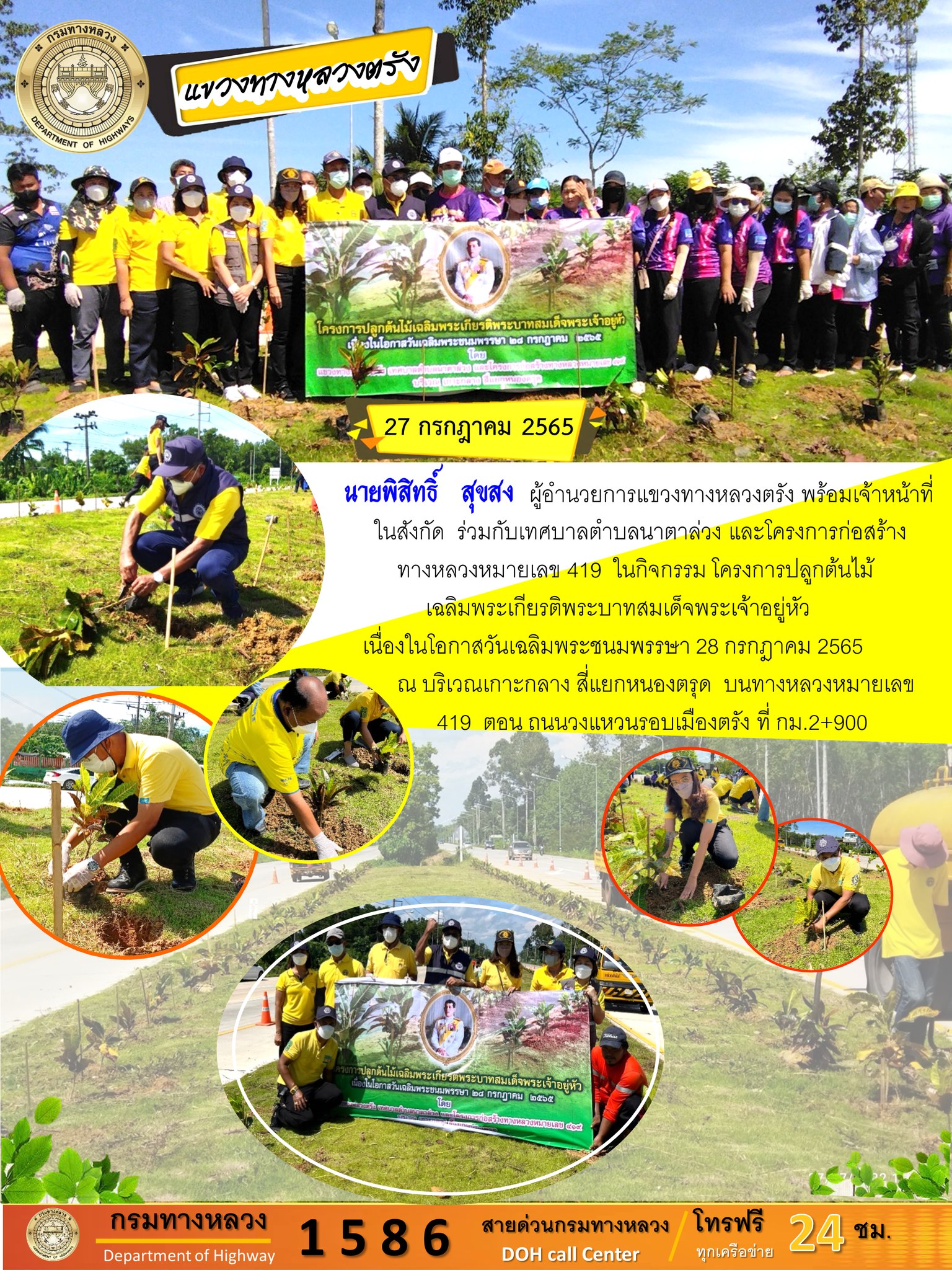 นายพิสิทธิ์ สุขสง ผู้อำนวยการแขวงทางหลวงตรัง พร้อมเจ้าหน้าที่ในสังกัด ร่วมกับ เทศบาลตำบลนาตาล่วง โครงการก่อสร้างทางหลวงหมายเลข 419 ในกิจกรรมโครงการปลูกต้นไม้เฉลิมพระเกียรติพระบาทสมเด็จพระเจ้าอยู่หัว เนื่องในโอกาสวันเฉลิมพระชนมพรรษา 28 กรกฎาคม 2565 ณ บริเวณเกาะกลาง สี่แยกหนองตรุด บนทางหลวงหมายเลข 419 ตอน ถนนวงแหวนรอบเมืองตรัง ที่ กม.2+900