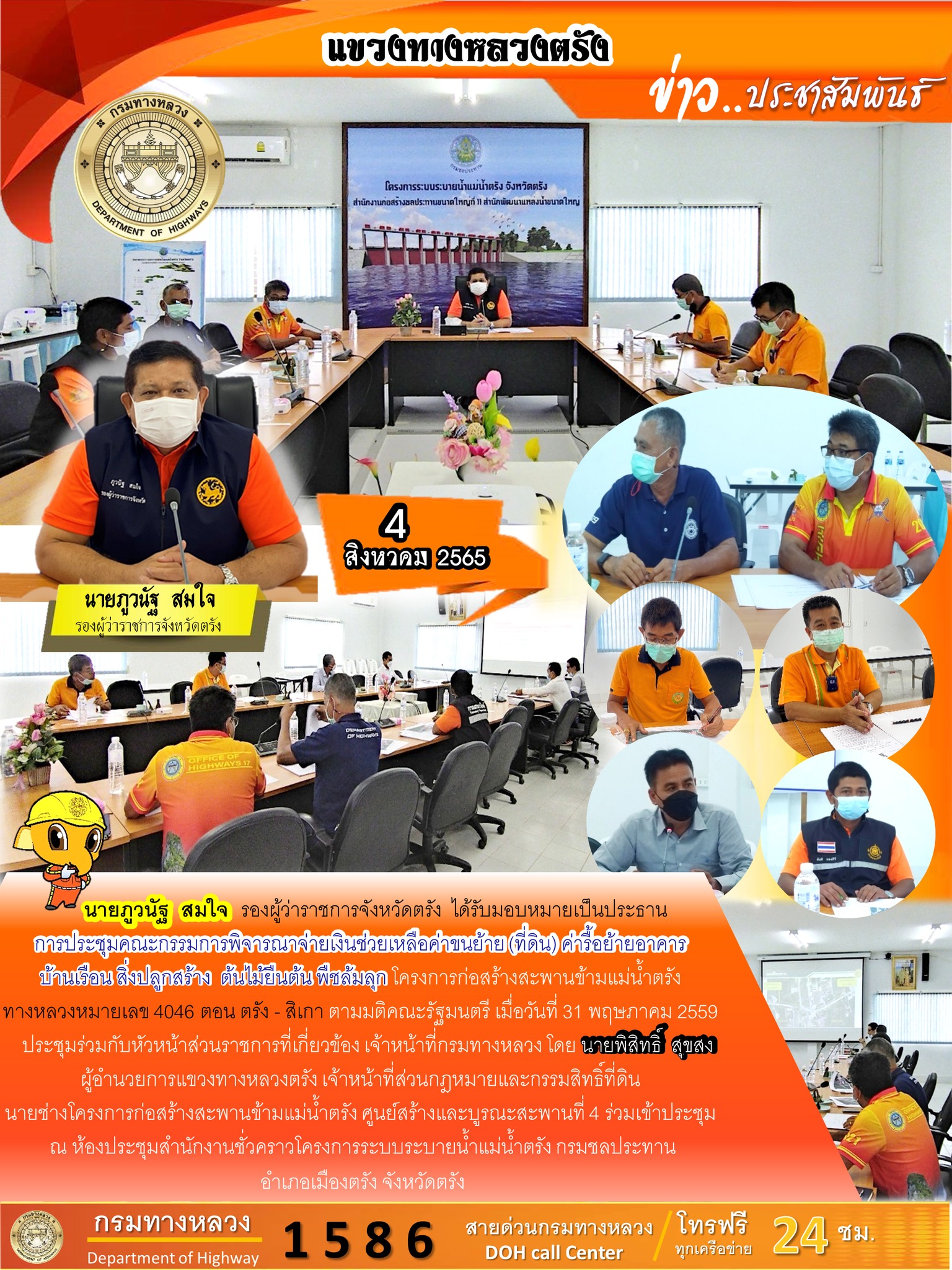 นายภูวนัฐ สมใจ รองผู้ว่าราชการจังหวัดตรัง ได้รับมอบหมายเป็นประธาน การประชุมคณะกรรมการพิจารณาจ่ายเงินช่วยเหลือค่าขนย้าย (ที่ดิน) ค่ารื้อย้ายอาคาร บ้านเรือน สิ่งปลูกสร้าง ต้นไม้ยืนต้น พืชล้มลุก โครงการก่อสร้างสะพานข้ามแม่น้ำตรัง ทางหลวงหมายเลข 4046 ตอน ตรัง - สิเกา ตามมติคณะรัฐมนตรี เมื่อวันที่ 31 พฤษภาคม 2559 ประชุมร่วมกับหัวหน้าส่วนราชการที่เกี่ยวข้อง เจ้าหน้าที่กรมทางหลวง โดย นายพิสิทธิ์ สุขสง ผู้อำนวยการแขวงทางหลวงตรัง เจ้าหน้าที่ส่วนกฎหมายและกรรมสิทธิ์ที่ดิน นายช่างโครงการก่อสร้างสะพานข้ามแม่น้ำตรัง ศูนย์สร้างและบูรณะสะพานที่ 4 ร่วมเข้าประชุม ณ ห้องประชุมสำนักงานชั่วคราวโครงการระบบระบายน้ำแม่น้ำตรัง กรมชลประทาน อำเภอเมืองตรัง จังหวัดตรัง