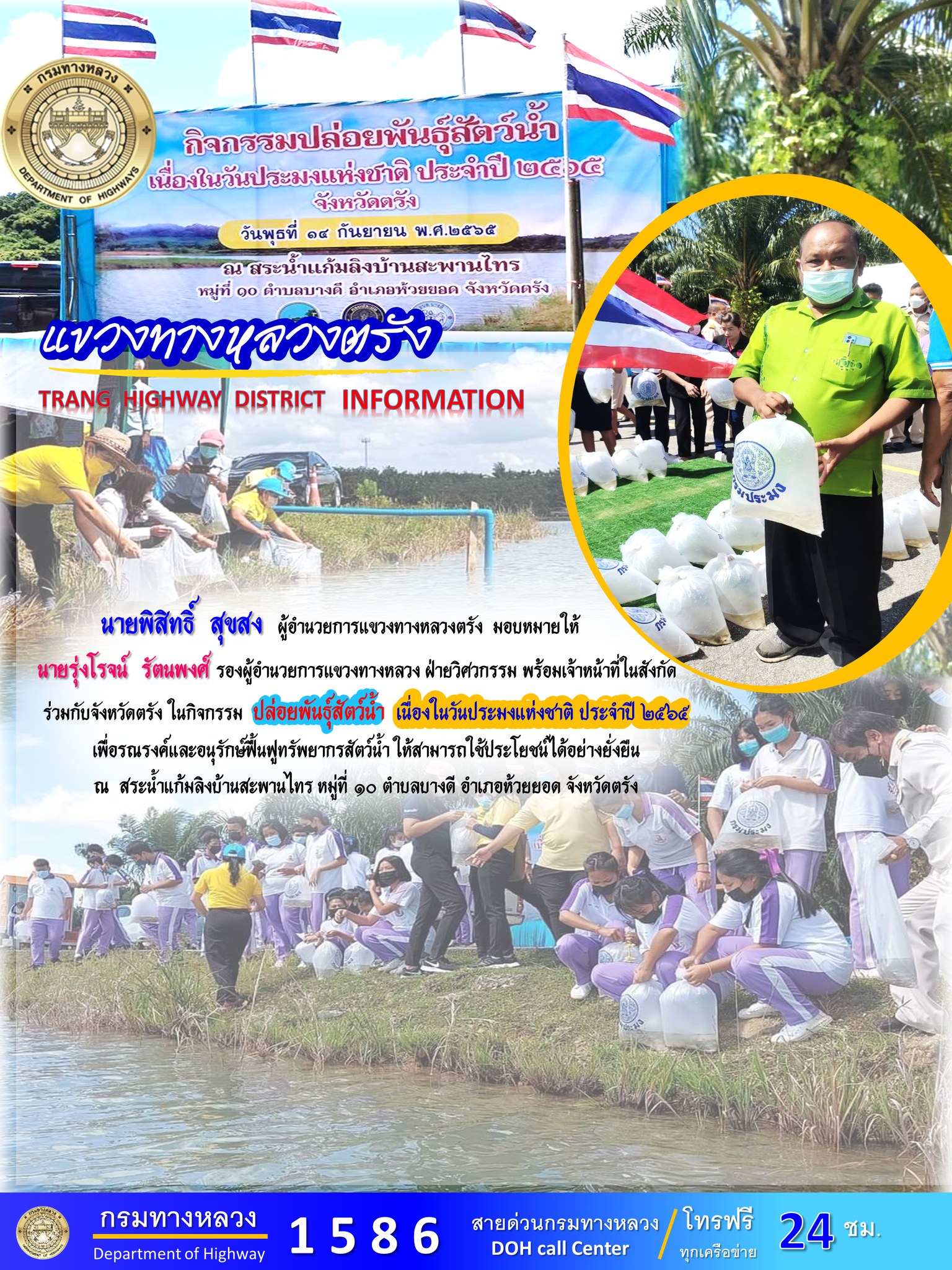 นายพิสิทธิ์ สุขสง ผู้อำนวยการแขวงทางหลวงตรัง มอบหมายให้ นายรุ่งโรจน์ รัตนพงศ์ รองผู้อำนวยการแขวงทางหลวง ฝ่ายวิศวกรรม พร้อมเจ้าหน้าที่ในสังกัด ร่วมกับจังหวัดตรัง ในกิจกรรม "ปล่อยพันธุ์สัตว์น้ำ เนื่องในวันประมงแห่งชาติ ประจำปี 2565" เพื่อรณรงค์ให้ประชาชนตระหนักถึงคุณค่าของทรัพยากรสัตว์น้ำตลอดจนมีส่วนร่วมในการอนุรักษ์และฟื้นฟูทรัพยากรสัตว์น้ำให้สามารถใช้ประโยชน์ได้อย่างยั่งยืน ณ สระน้ำแก้มลิงบ้านสะพานไทร หมู่ที่ 10 ตำบลบางดี อำเภอห้วยยอด จังหวัดตรัง